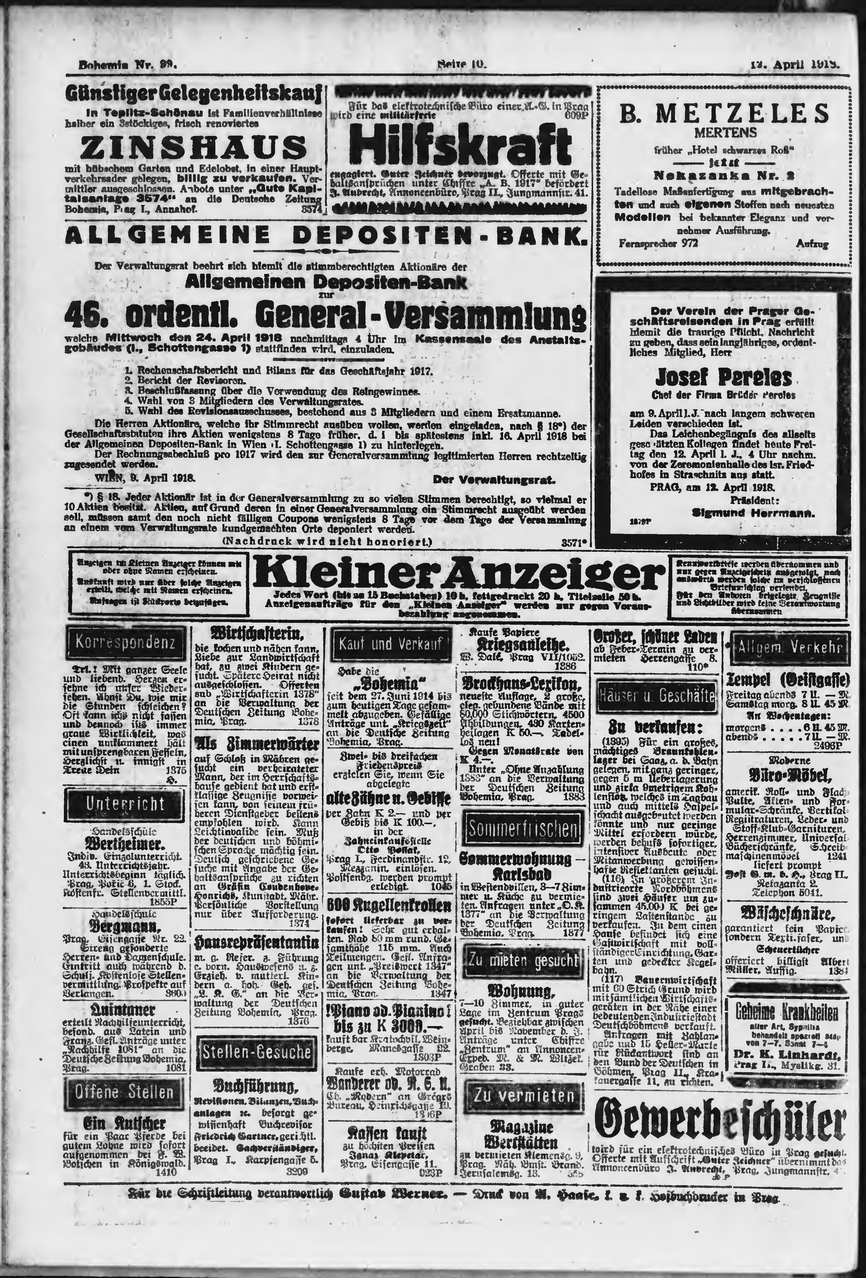 * Datum vydání výtisku: 12.4.1918 Číslo výtisku: 99 Poznámky k výtisku: ranní vydání;