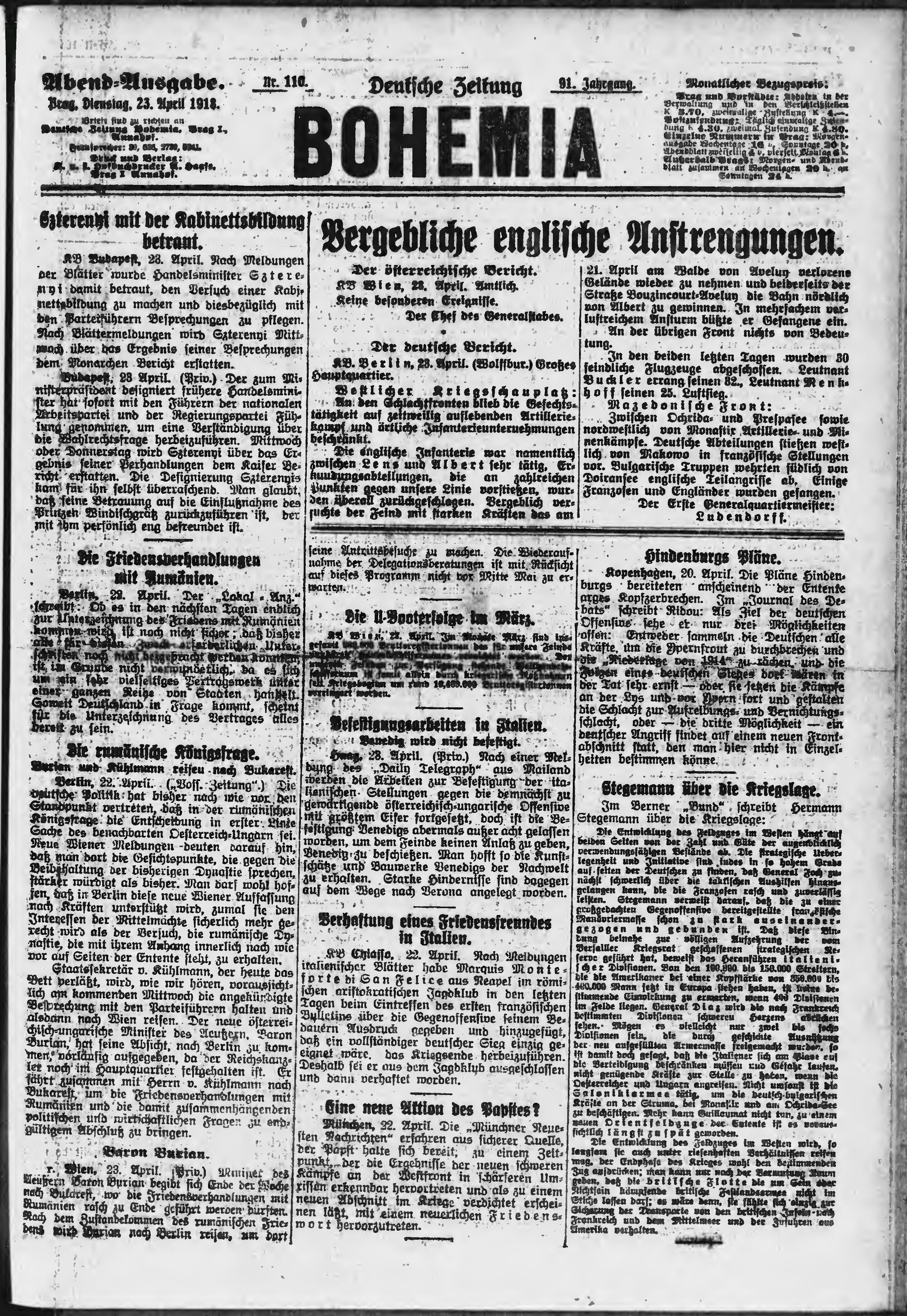 * Datum vydání výtisku: 23.4.1918 Číslo výtisku: 110 Poznámky k výtisku: večerní vydání;