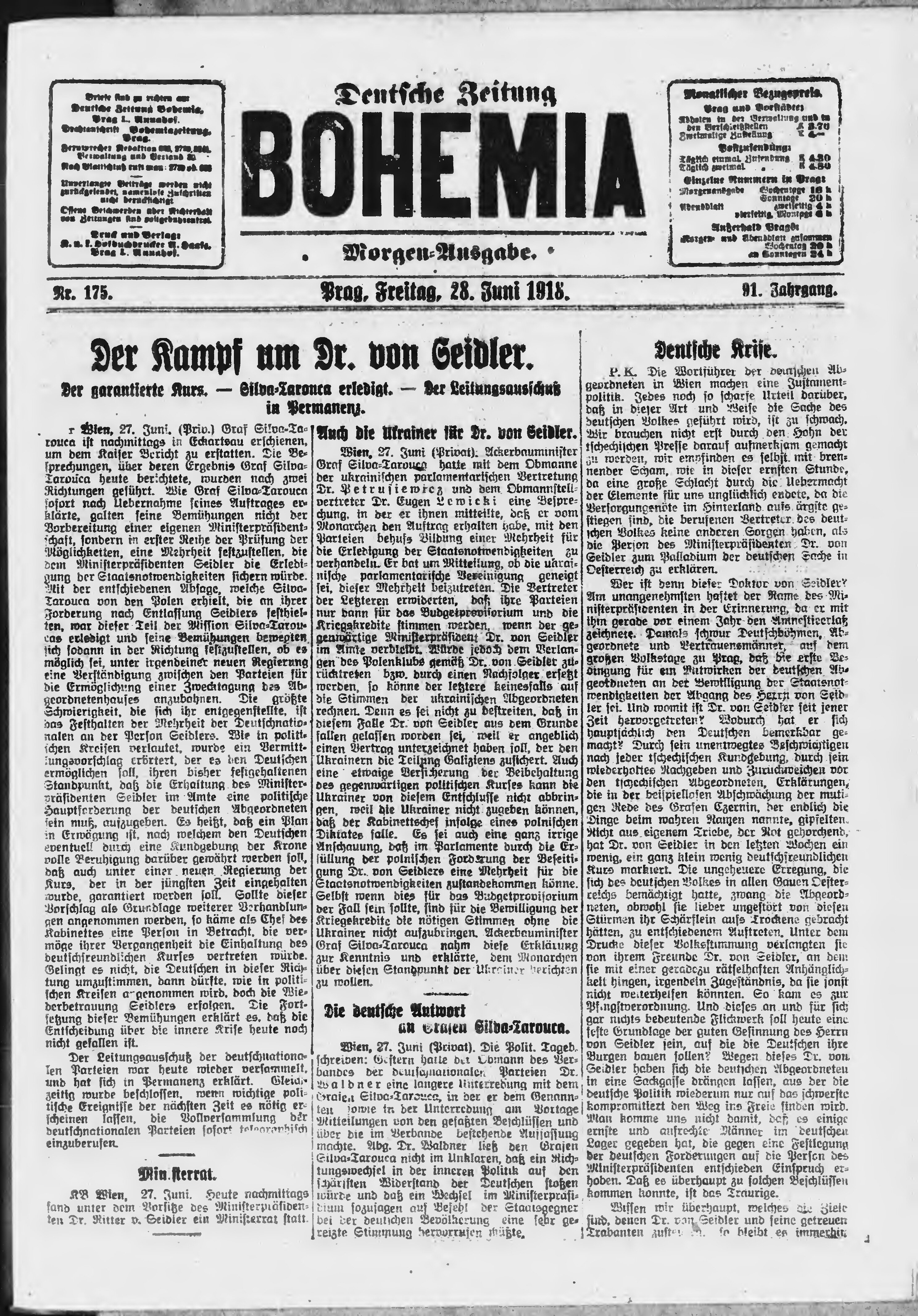 * Datum vydání výtisku: 28.6.1918 Číslo výtisku: 175 Poznámky k výtisku: ranní vydání;