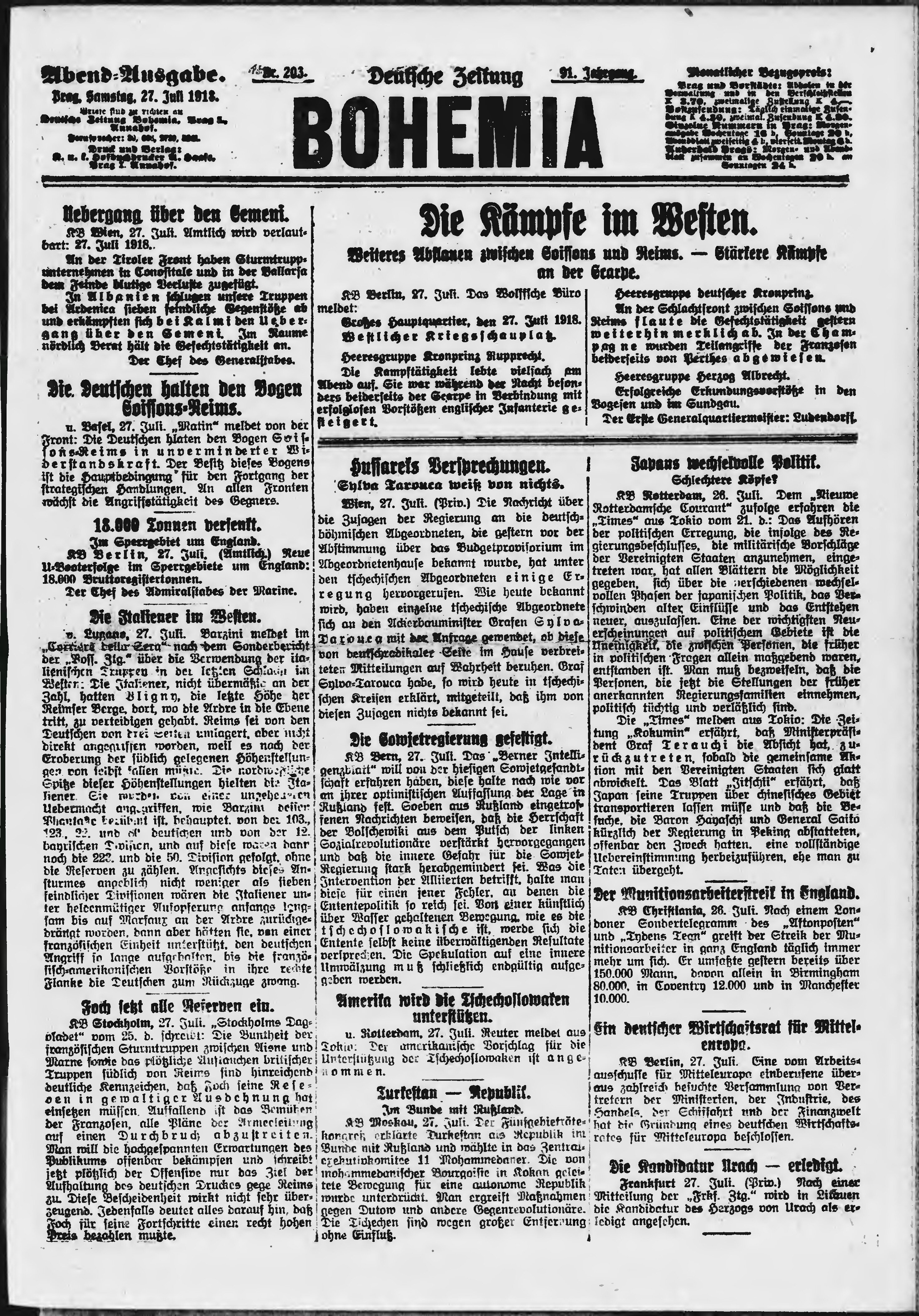 * Datum vydání výtisku: 27.7.1918 Číslo výtisku: 203 Poznámky k výtisku: večerní vydání;
