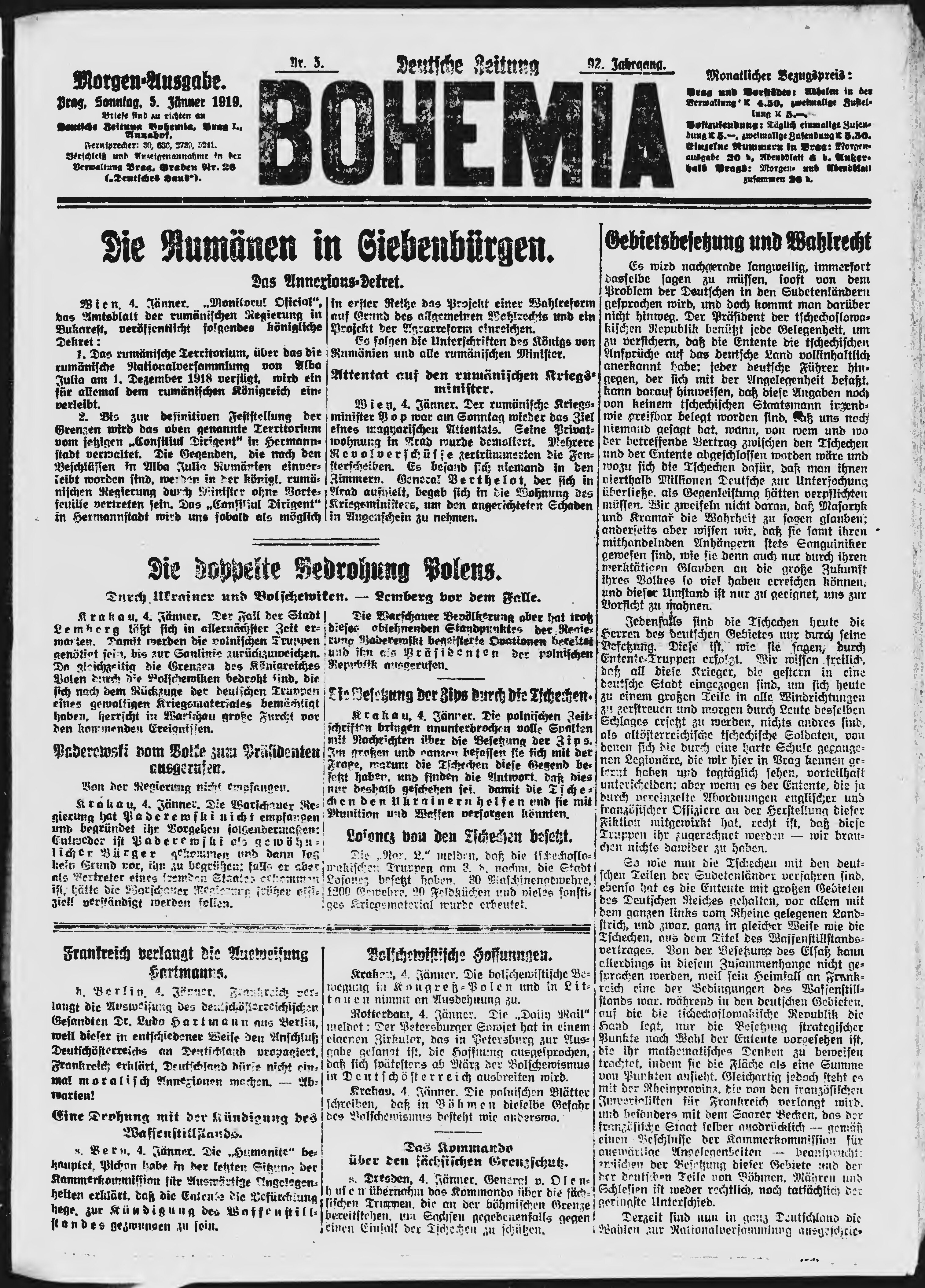 * Datum vydání výtisku: 5.1.1919 Číslo výtisku: 5 Poznámky k výtisku: ranní vydání;