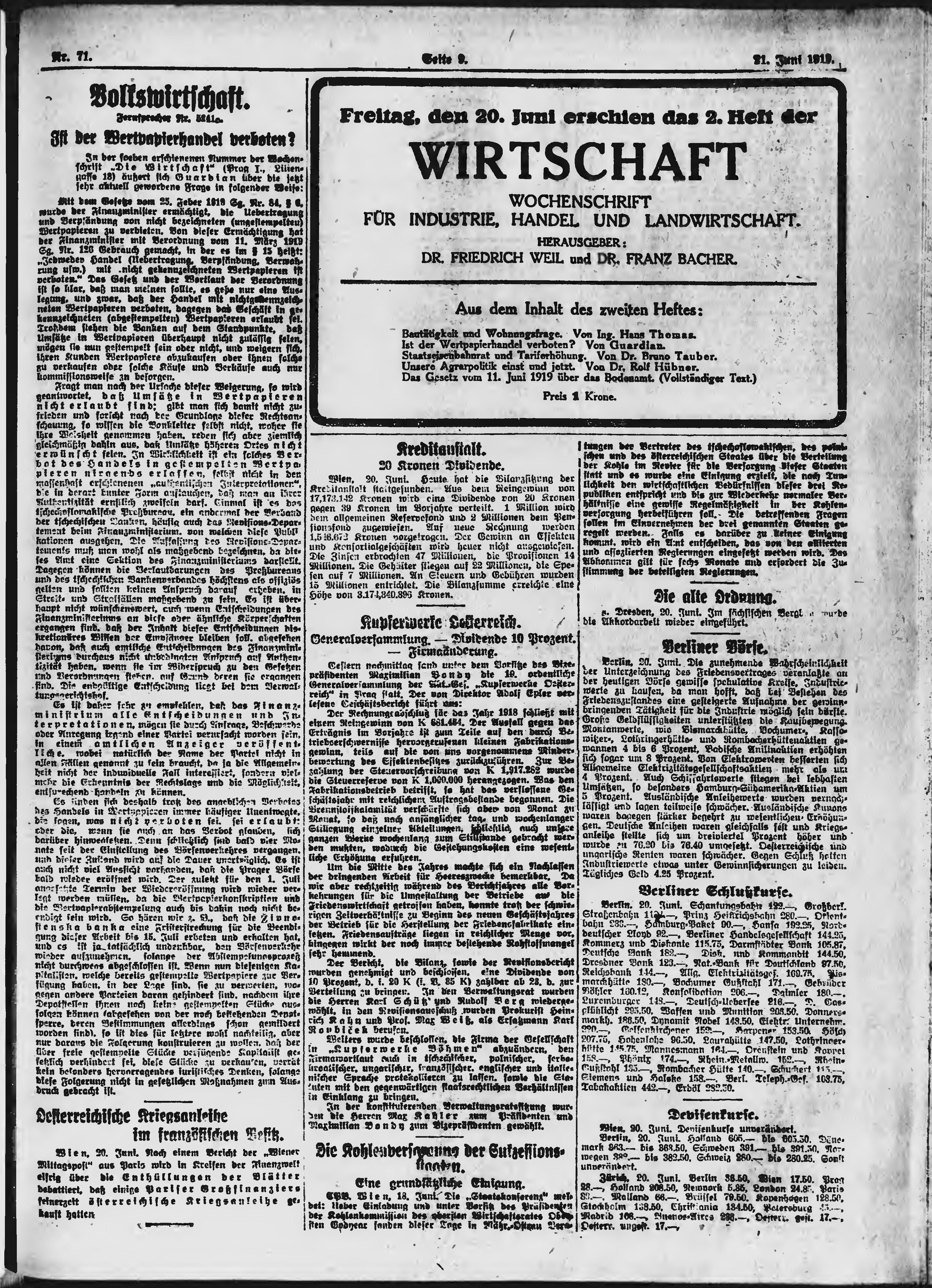 * Datum vydání výtisku: 21.6.1919 Číslo výtisku: 71 Poznámky k výtisku: ranní vydání;