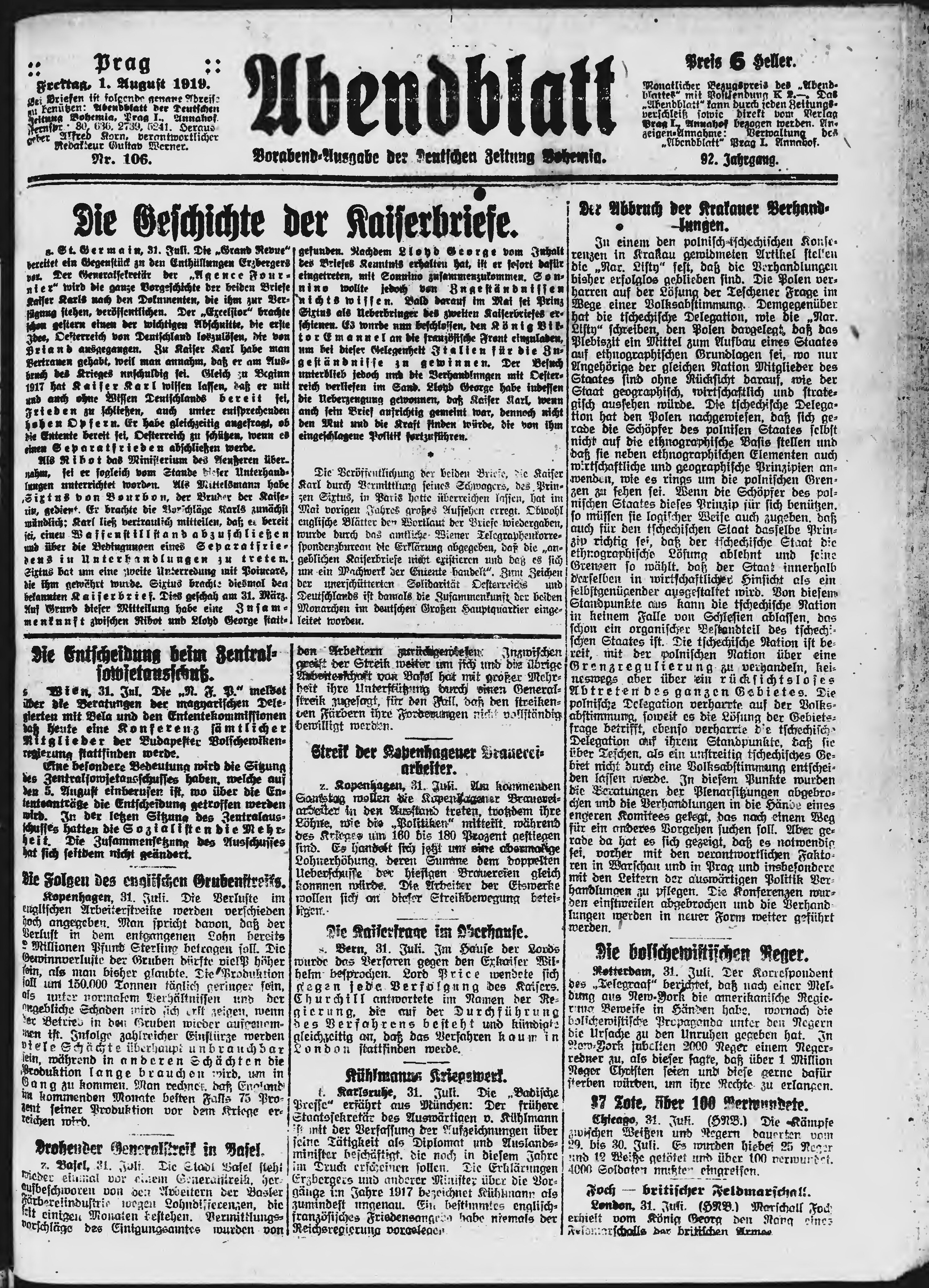 * Datum vydání výtisku: 1.8.1919 Číslo výtisku: 106 Poznámky k výtisku: večerní vydání;