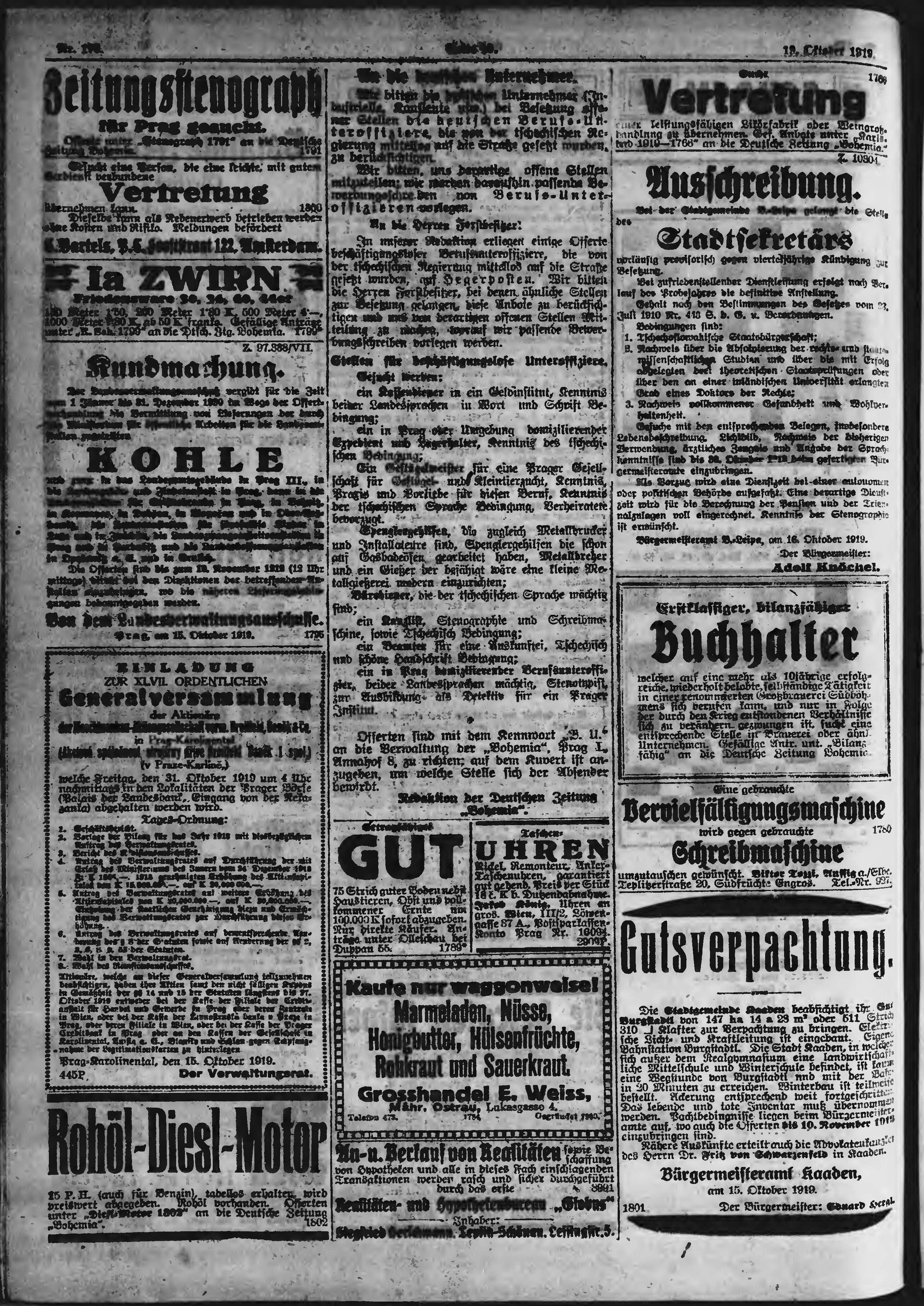 * Datum vydání výtisku: 19.10.1919 Číslo výtisku: 173 Poznámky k výtisku: ranní vydání;