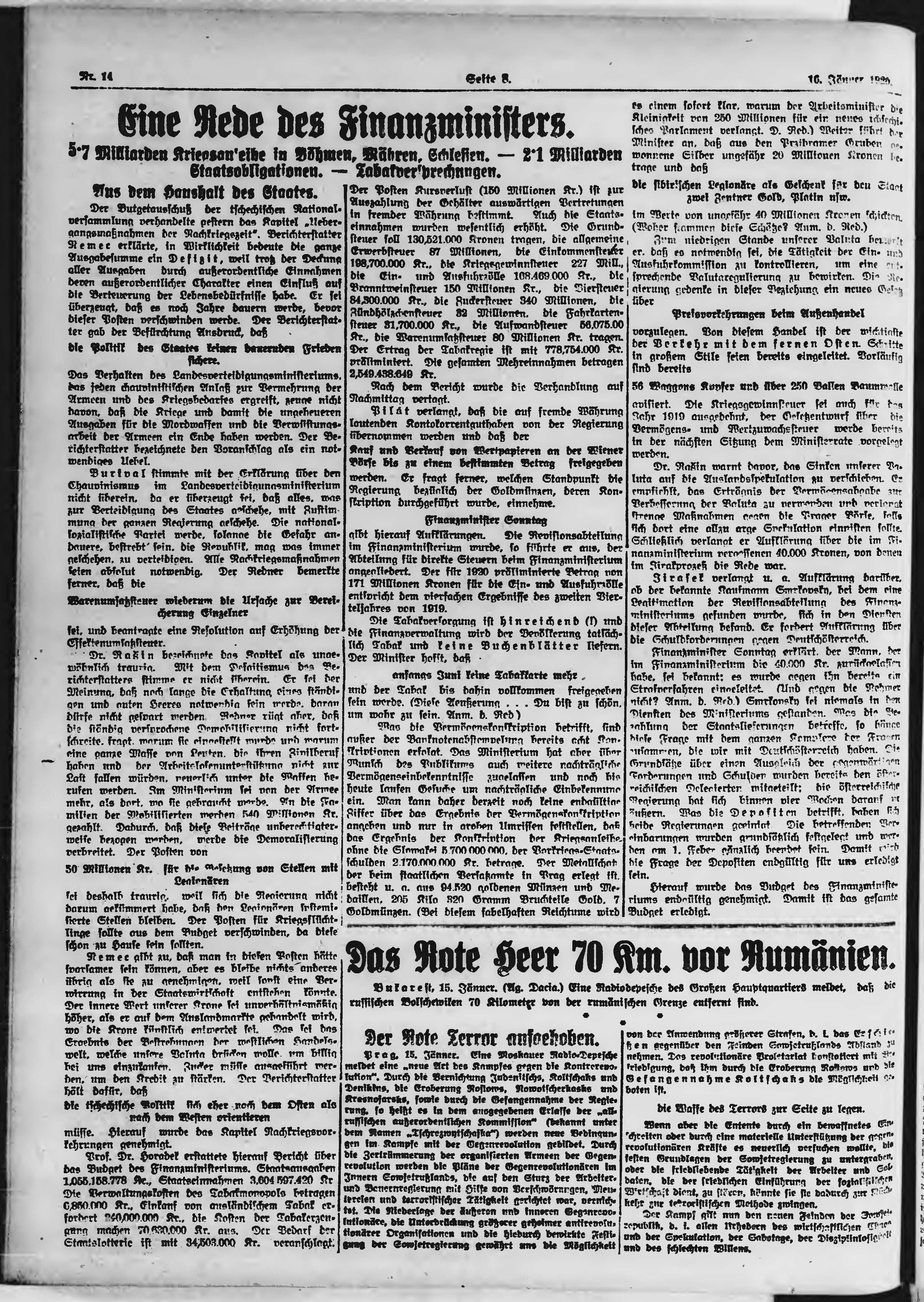 * Datum vydání výtisku: 16.1.1920 Číslo výtisku: 14 Poznámky k výtisku: ranní vydání;