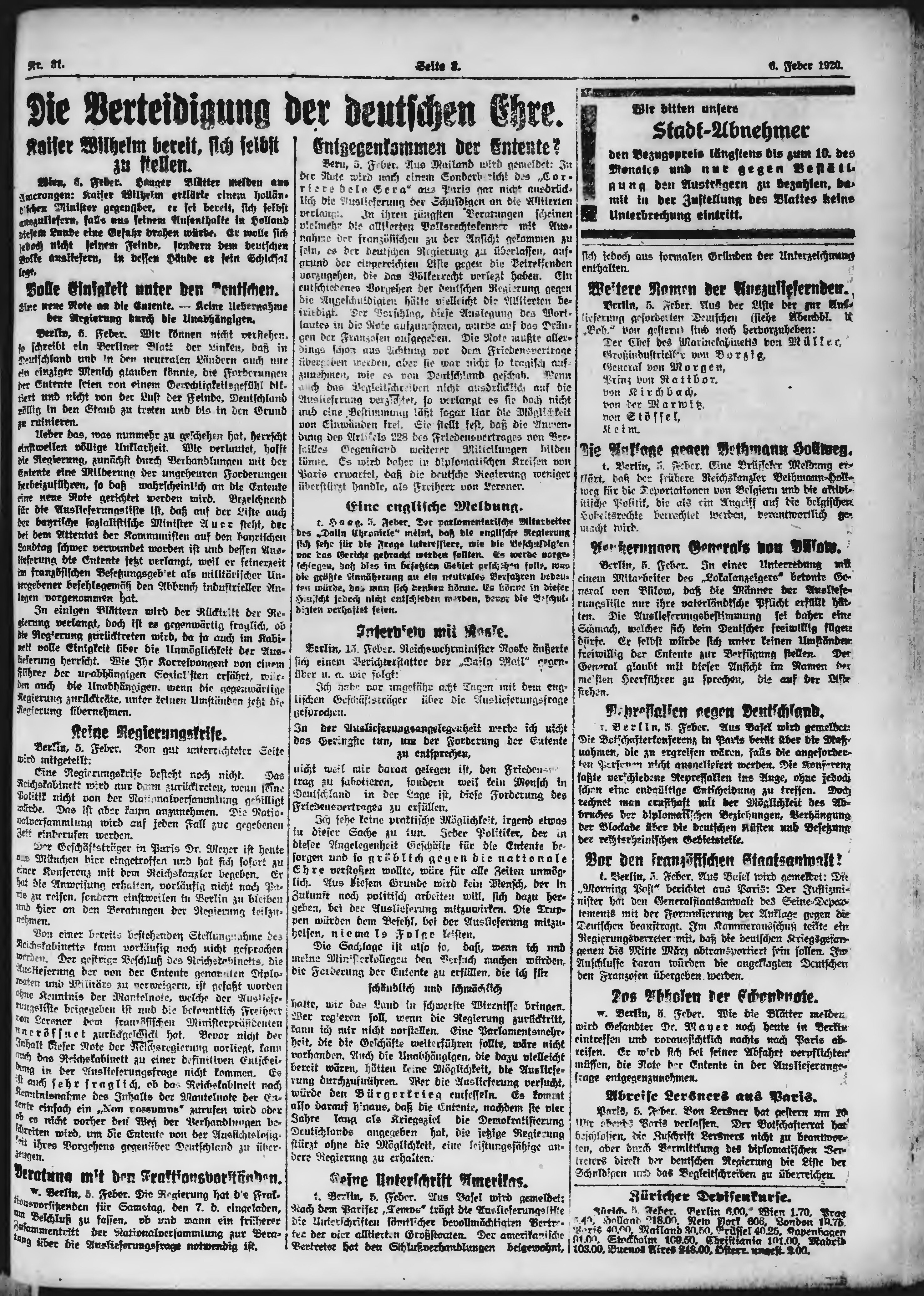 * Datum vydání výtisku: 6.2.1920 Číslo výtisku: 31 Poznámky k výtisku: ranní vydání;