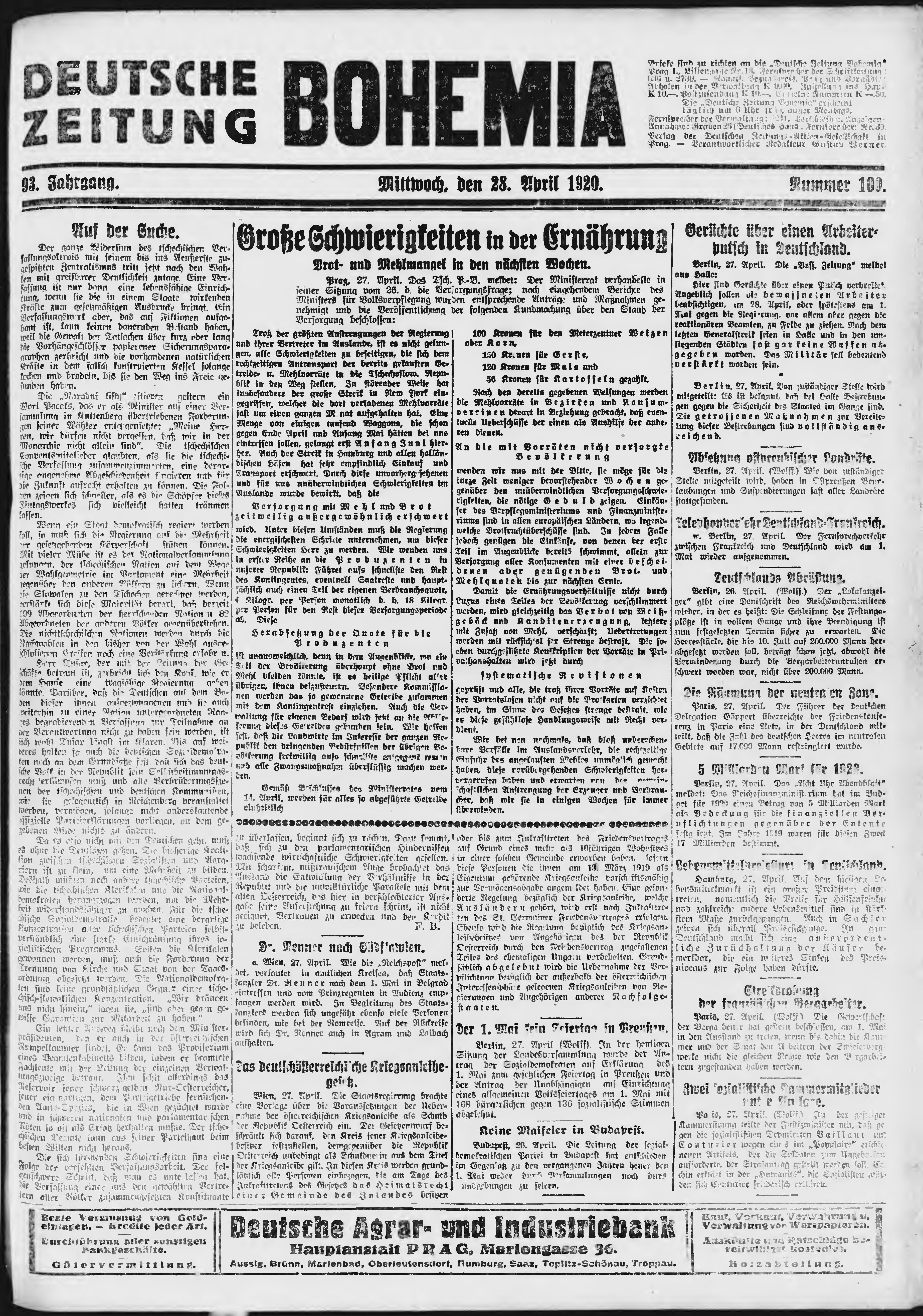 * Datum vydání výtisku: 28.4.1920 Číslo výtisku: 100 Poznámky k výtisku: ranní vydání;