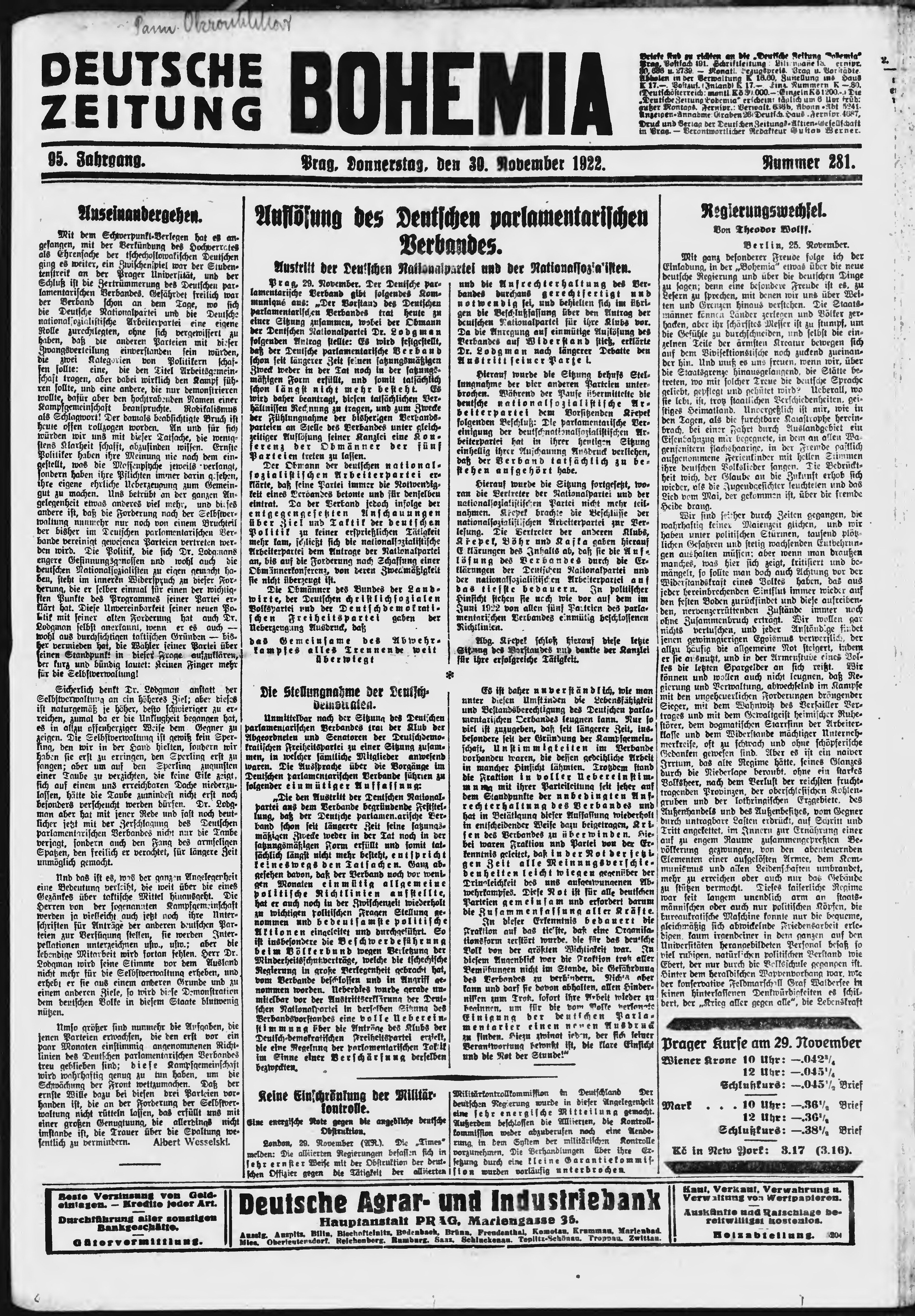 * Datum vydání výtisku: 30.11.1922 Číslo výtisku: 281 Poznámky k výtisku: ranní vydání;