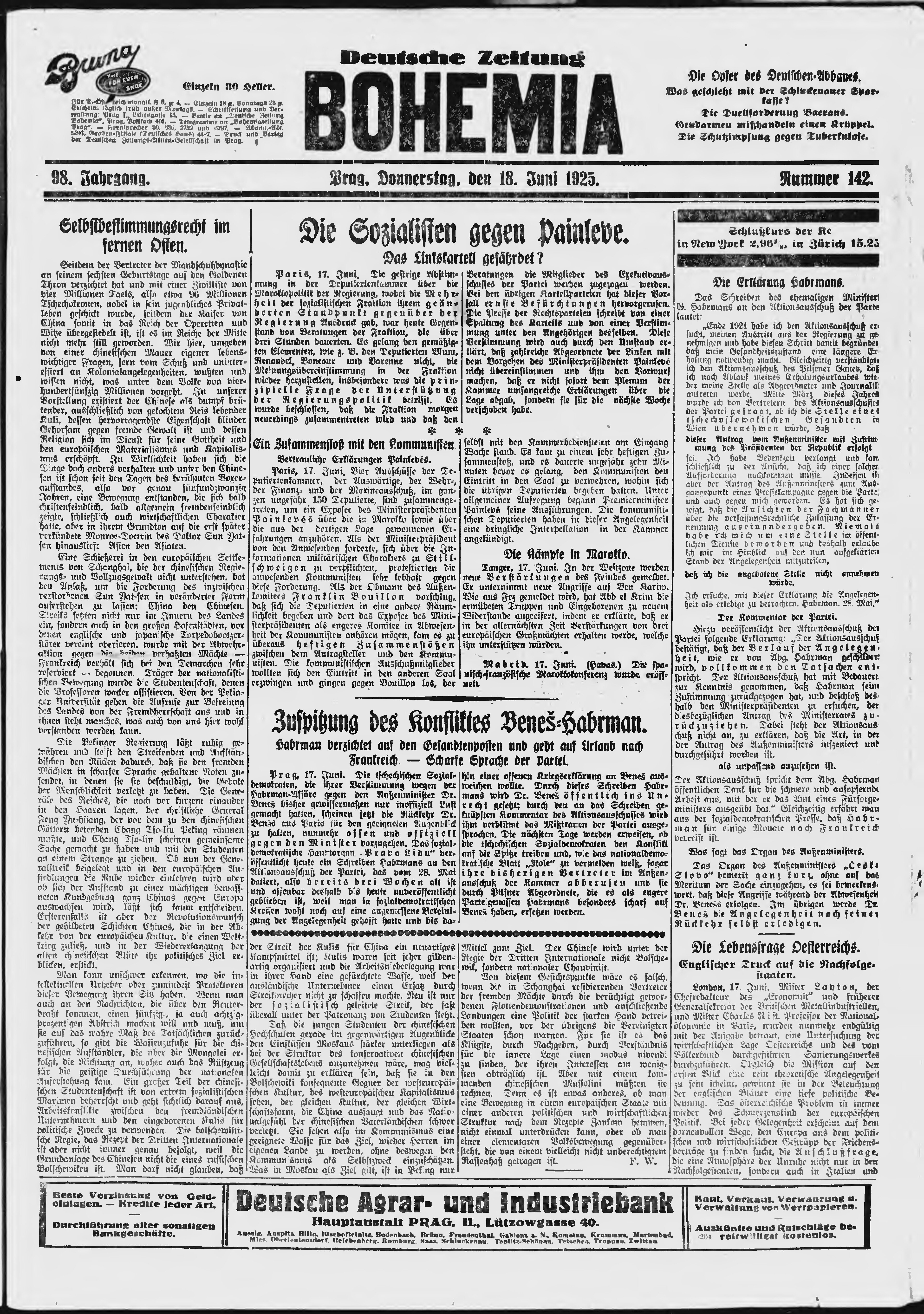 * Datum vydání výtisku: 18.6.1925 Číslo výtisku: 142 Poznámky k výtisku: ranní vydání;