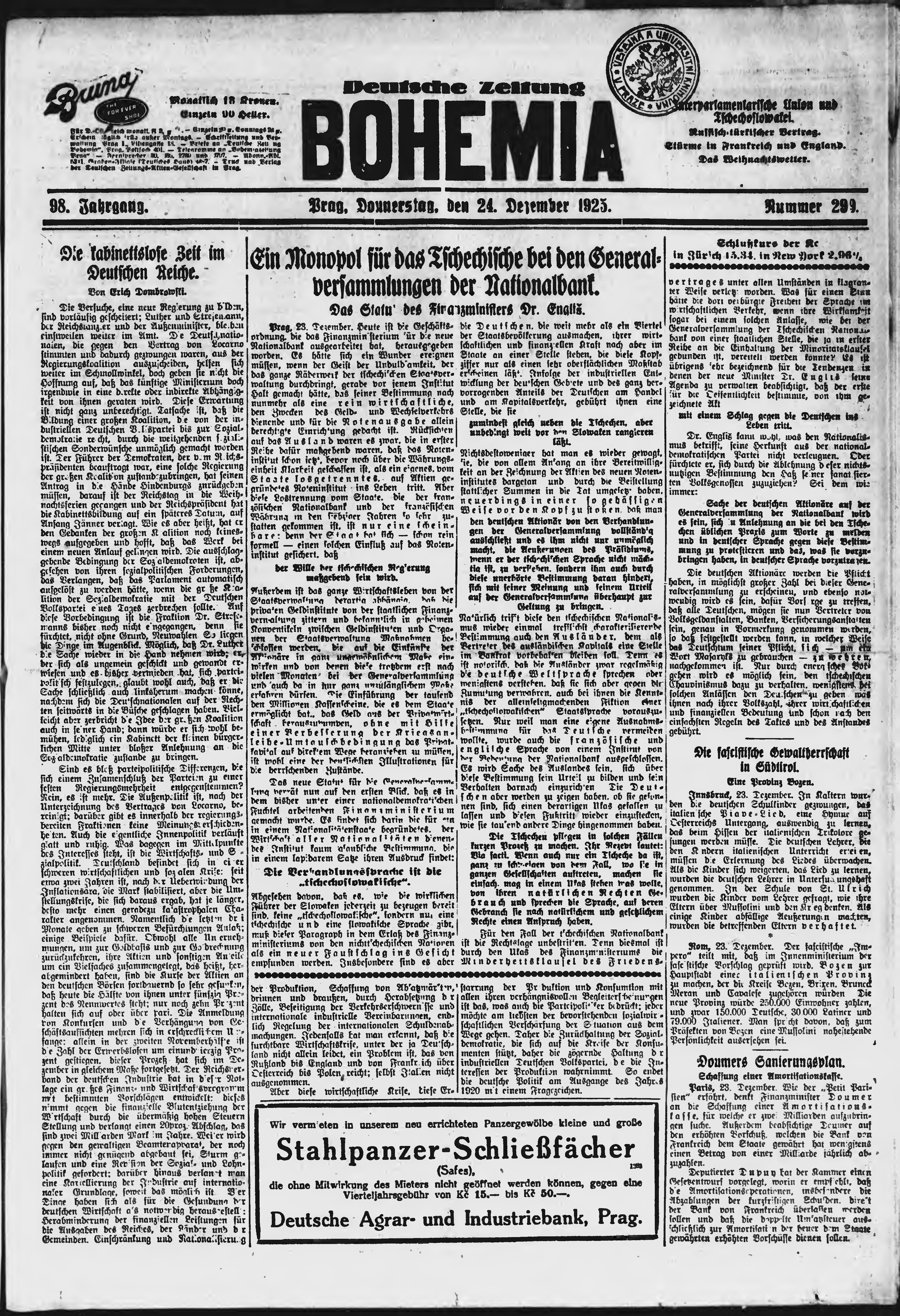 * Datum vydání výtisku: 24.12.1925 Číslo výtisku: 299 Poznámky k výtisku: ranní vydání;