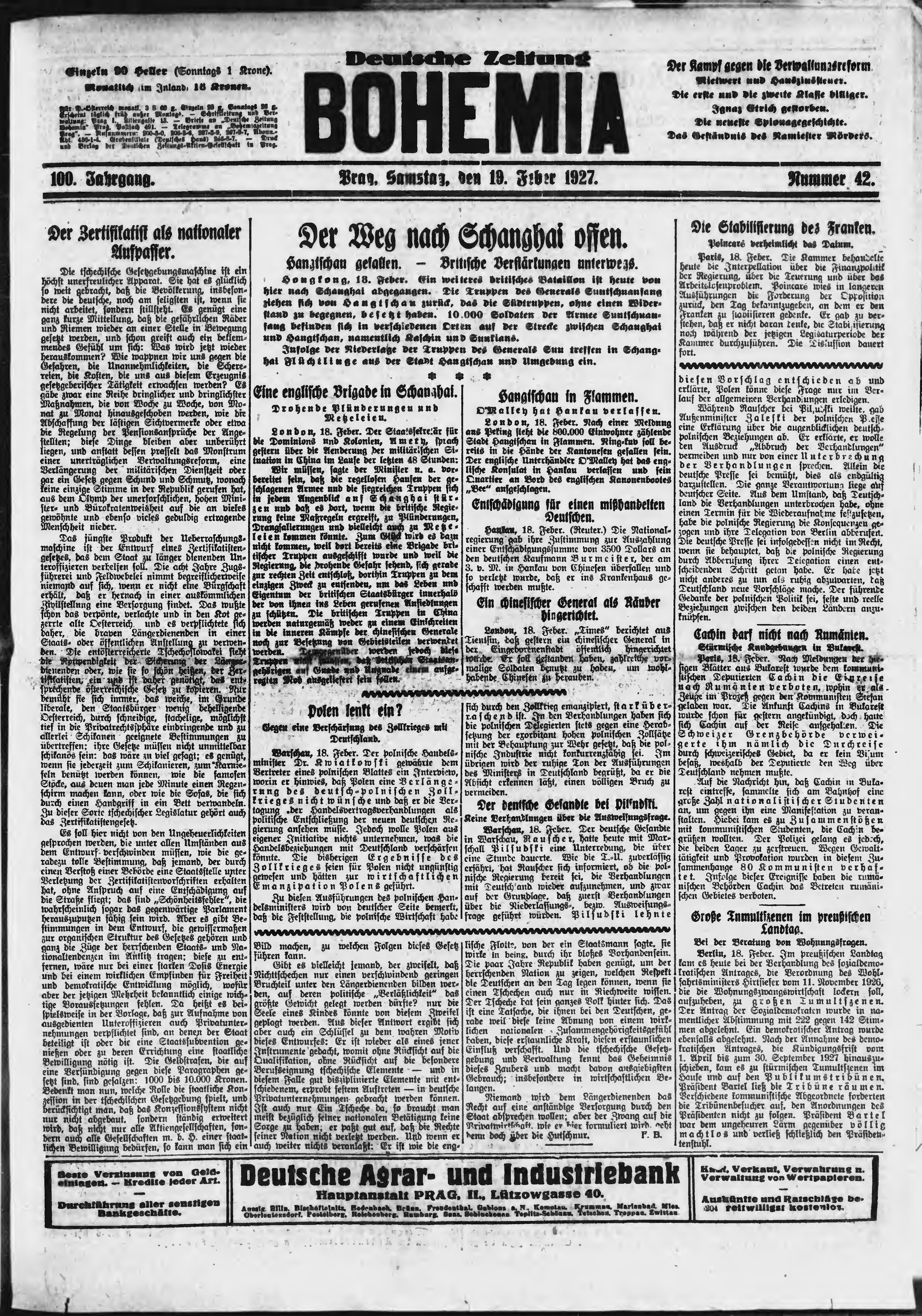 * Datum vydání výtisku: 19.2.1927 Číslo výtisku: 42 Poznámky k výtisku: ranní vydání;