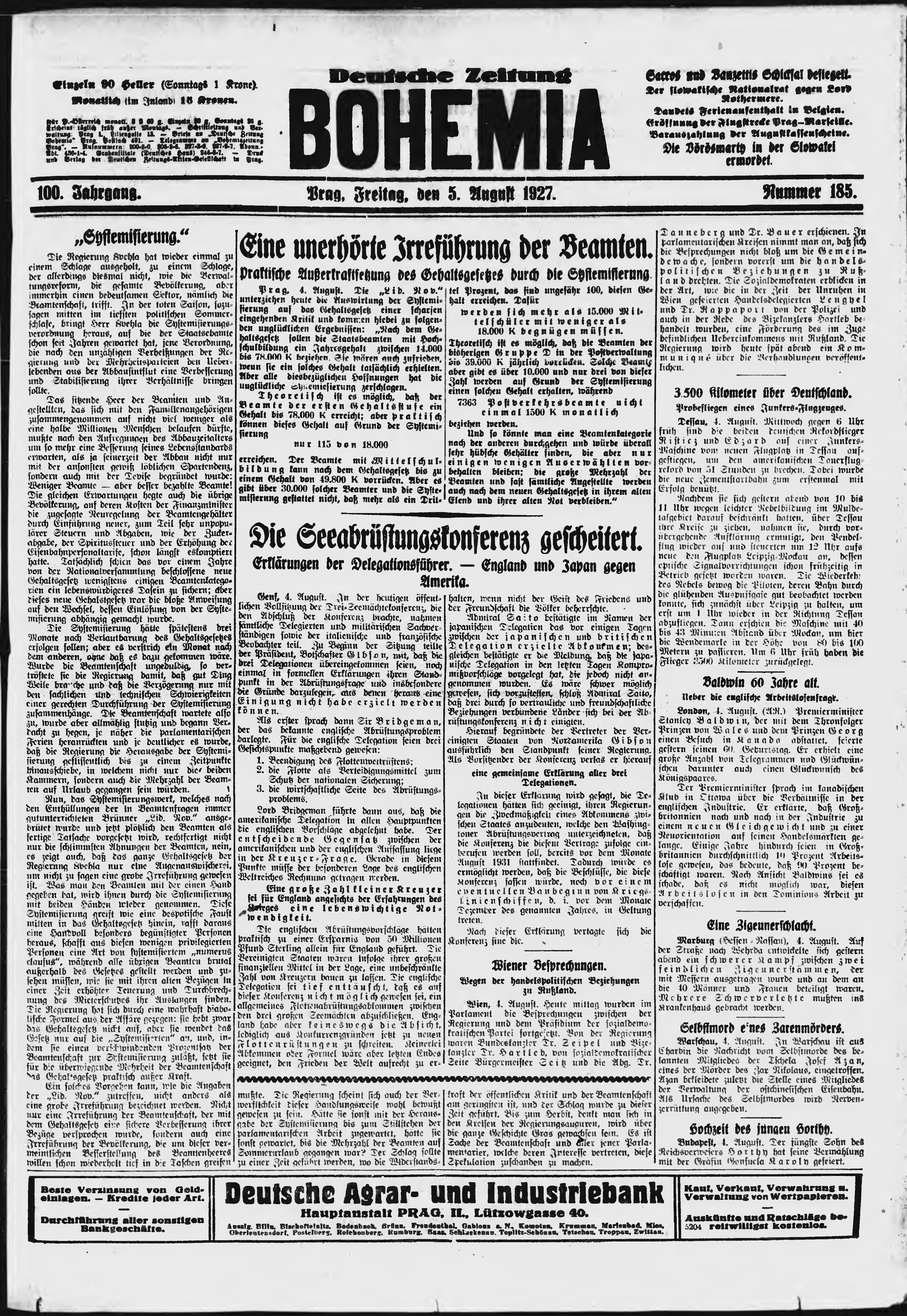 * Datum vydání výtisku: 5.8.1927 Číslo výtisku: 185 Poznámky k výtisku: ranní vydání;