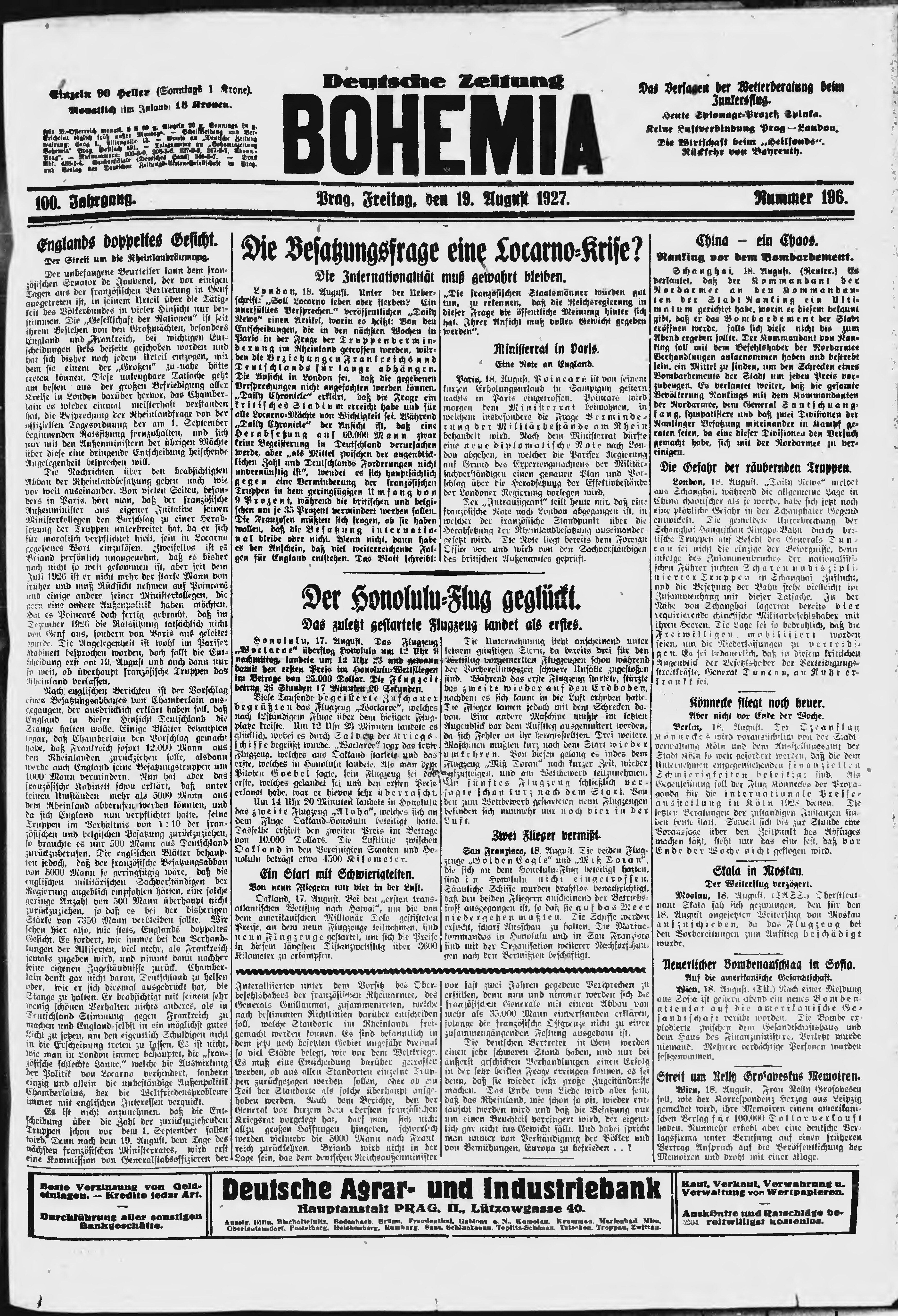 * Datum vydání výtisku: 19.8.1927 Číslo výtisku: 196 Poznámky k výtisku: ranní vydání;