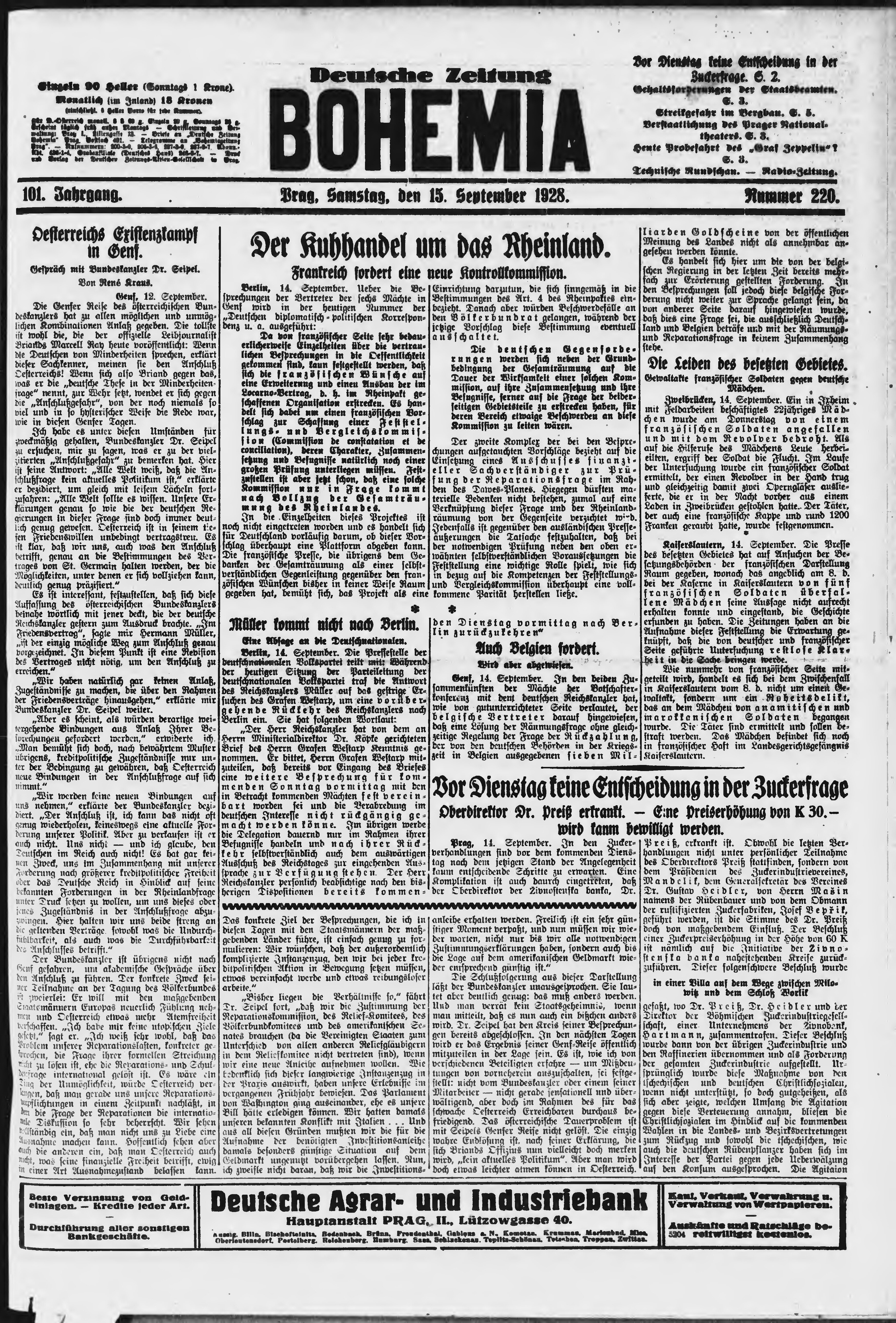 * Datum vydání výtisku: 15.9.1928 Číslo výtisku: 220 Poznámky k výtisku: ranní vydání;