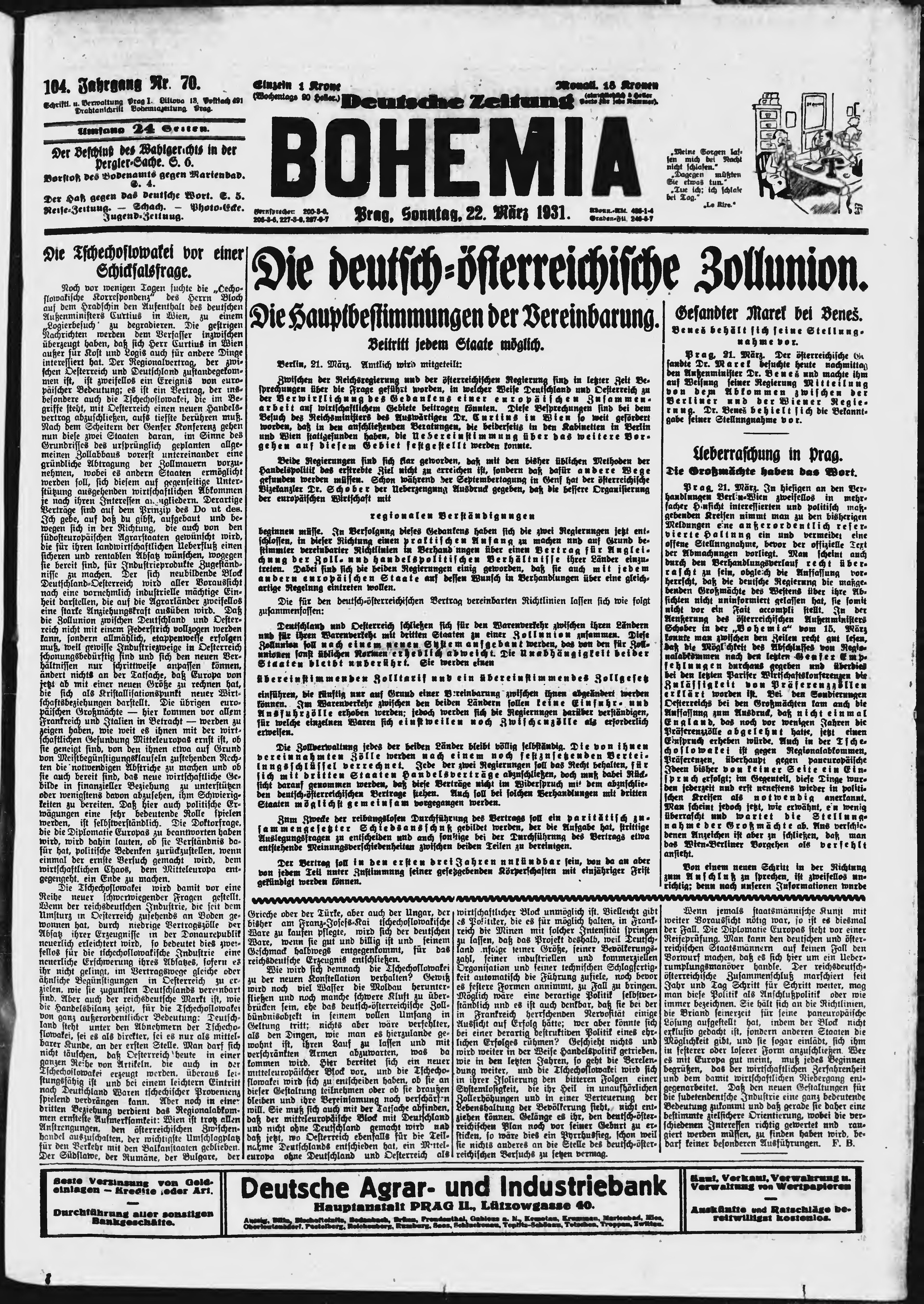 * Datum vydání výtisku: 22.3.1931 Číslo výtisku: 70 Poznámky k výtisku: ranní vydání;