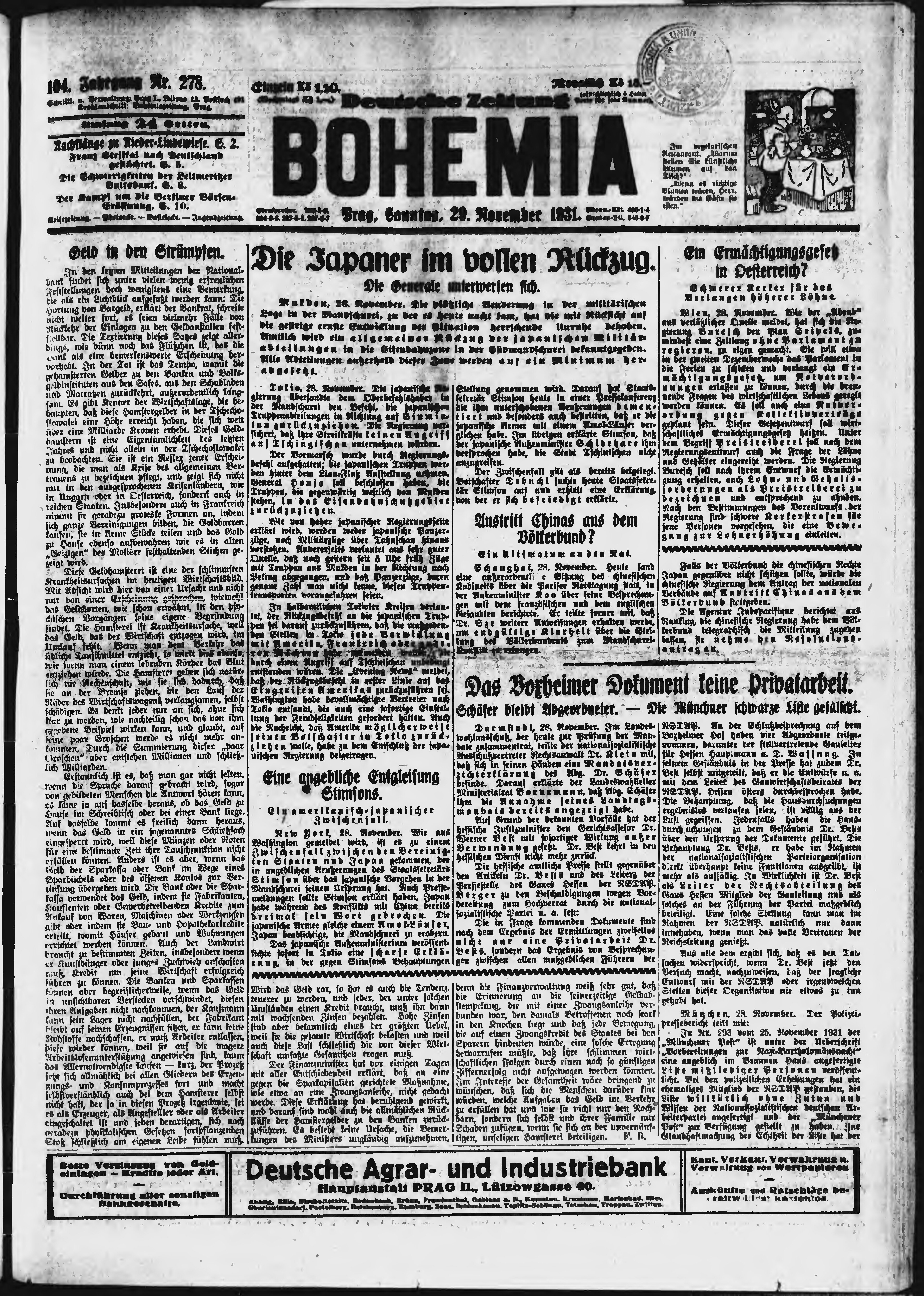 * Datum vydání výtisku: 29.11.1931 Číslo výtisku: 278 Poznámky k výtisku: ranní vydání;