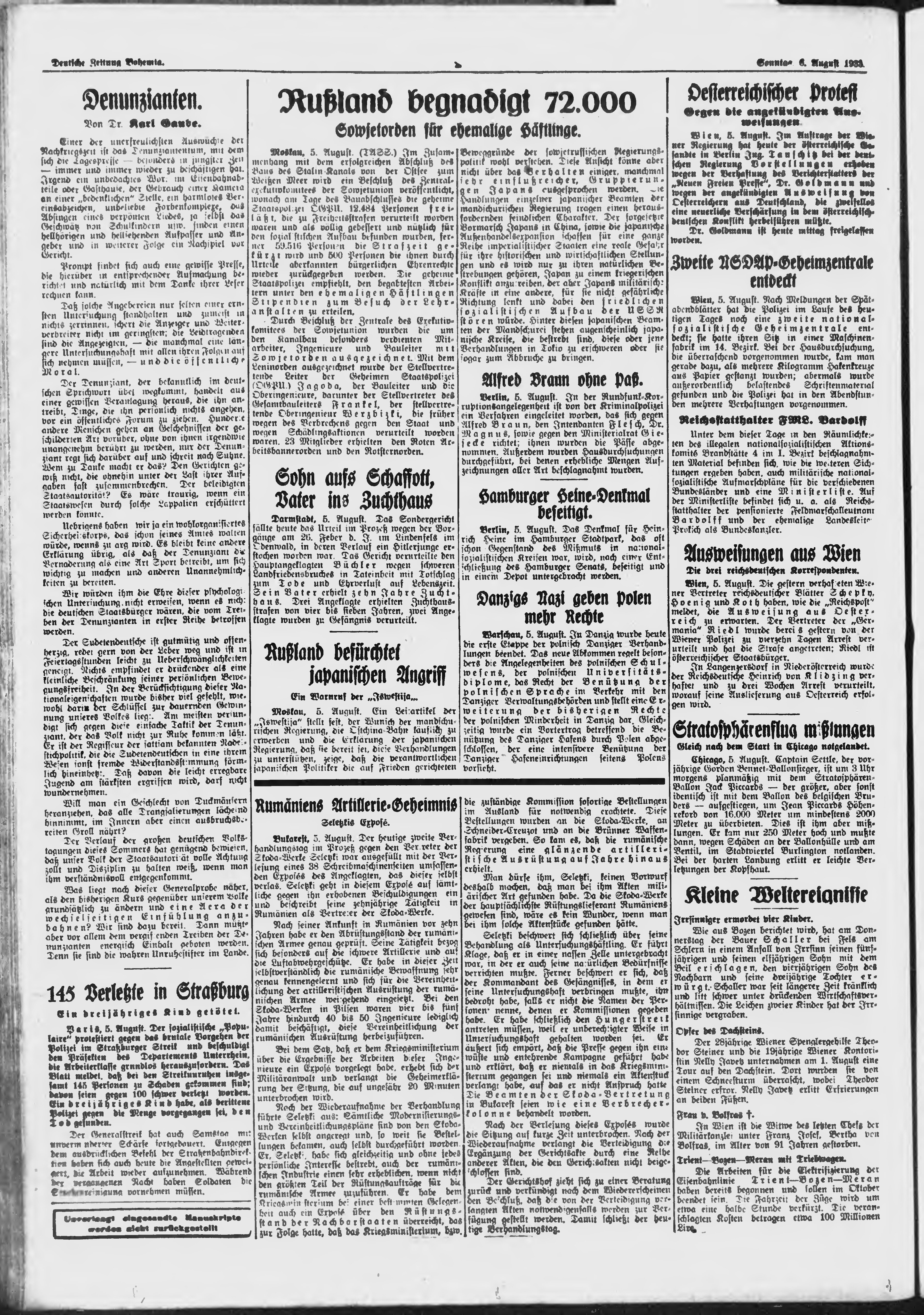 * Datum vydání výtisku: 6.8.1933 Číslo výtisku: 182 Poznámky k výtisku: ranní vydání;