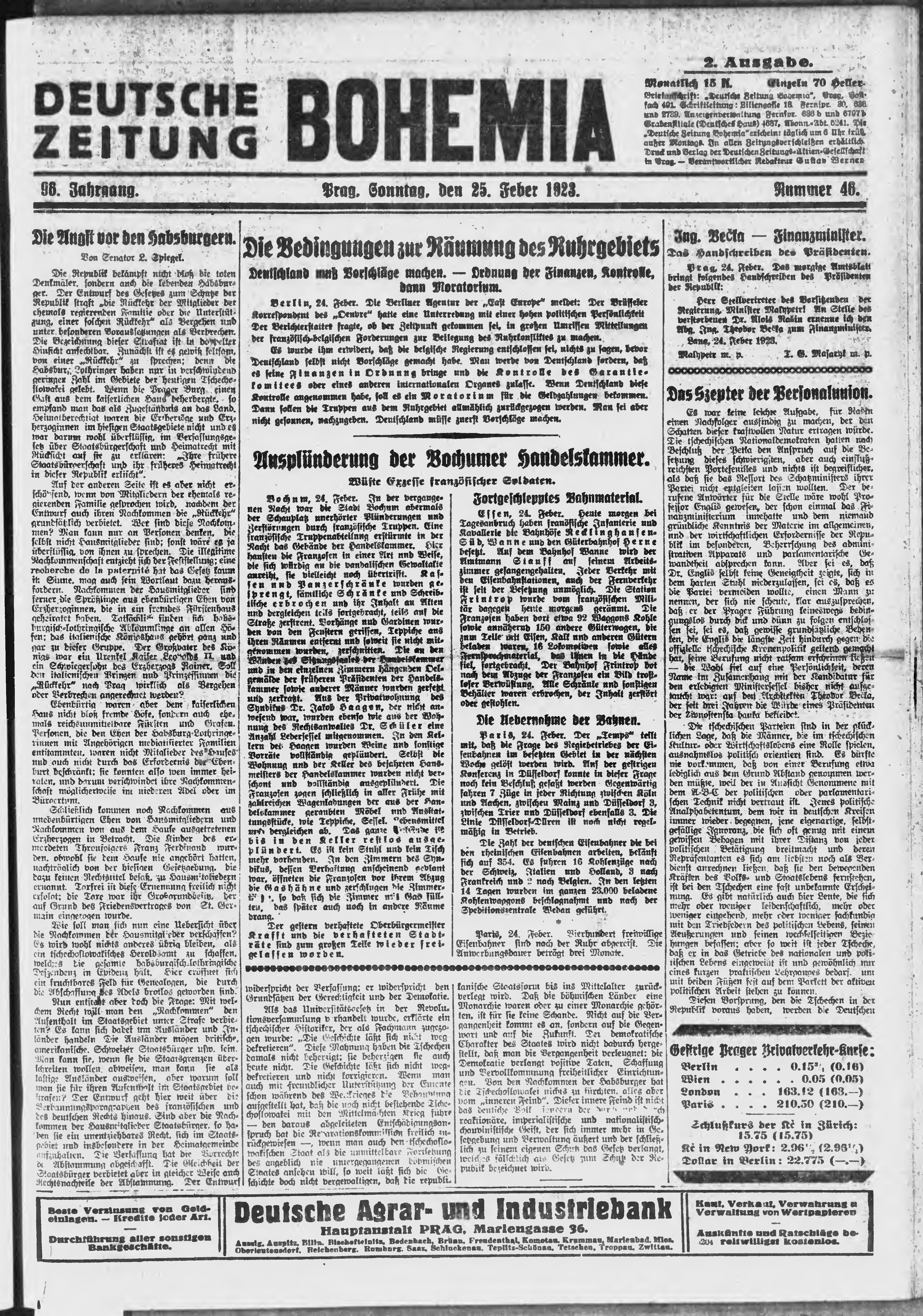 * Datum vydání výtisku: 25.2.1923 Číslo výtisku: 46 Poznámky k výtisku: ranní vydání;