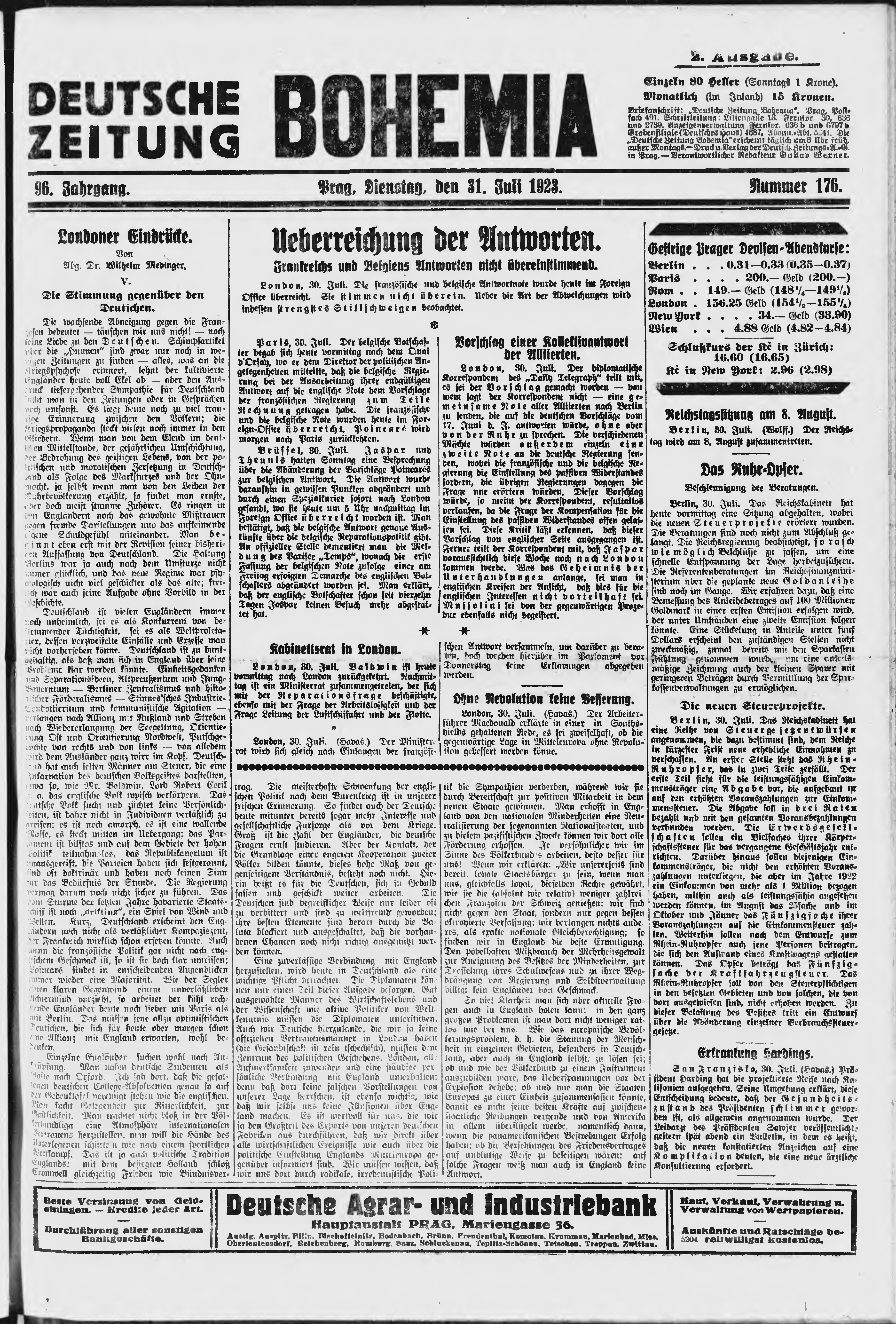 * Datum vydání výtisku: 31.7.1923 Číslo výtisku: 176 Poznámky k výtisku: ranní vydání;