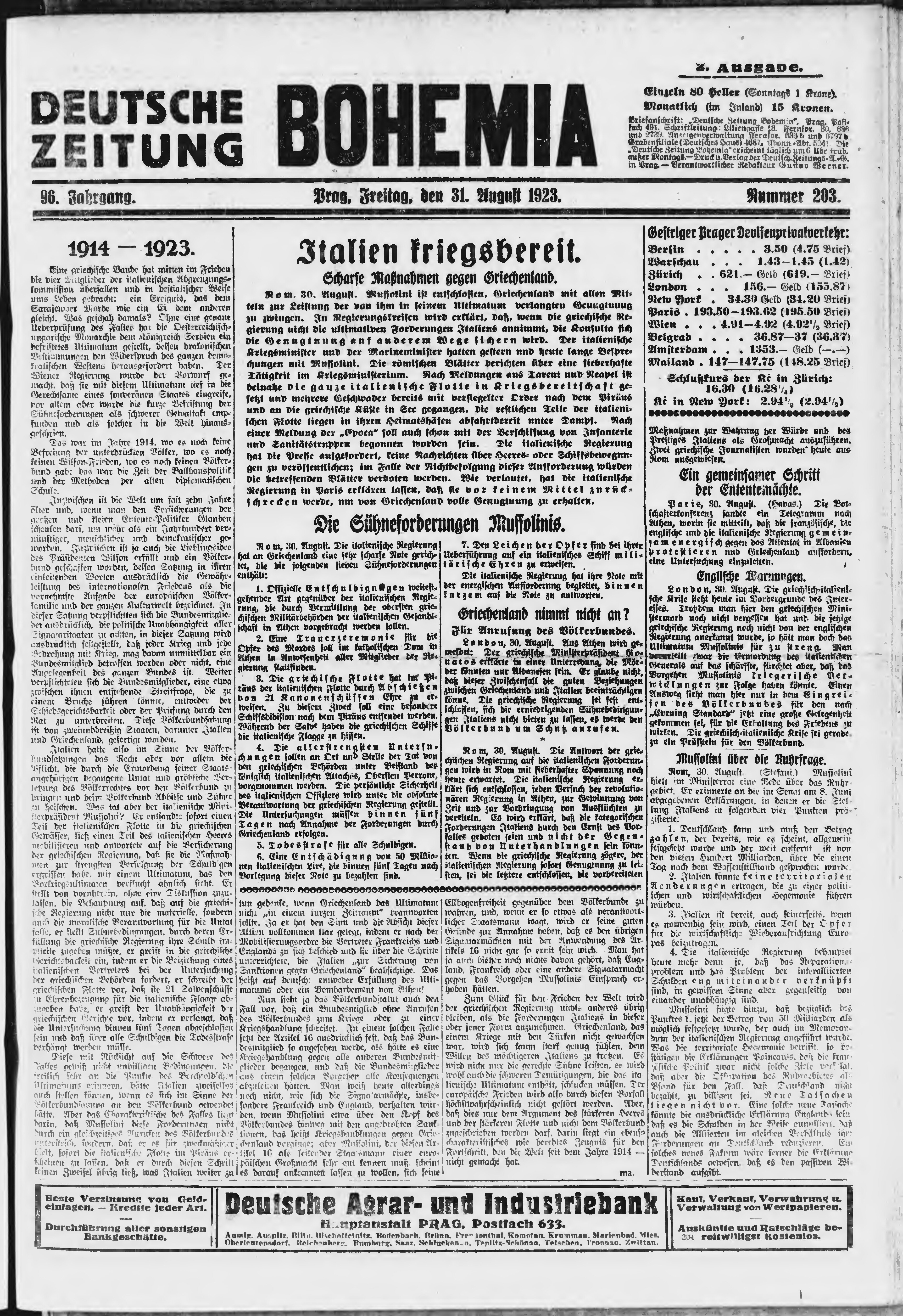 * Datum vydání výtisku: 31.8.1923 Číslo výtisku: 203 Poznámky k výtisku: ranní vydání;