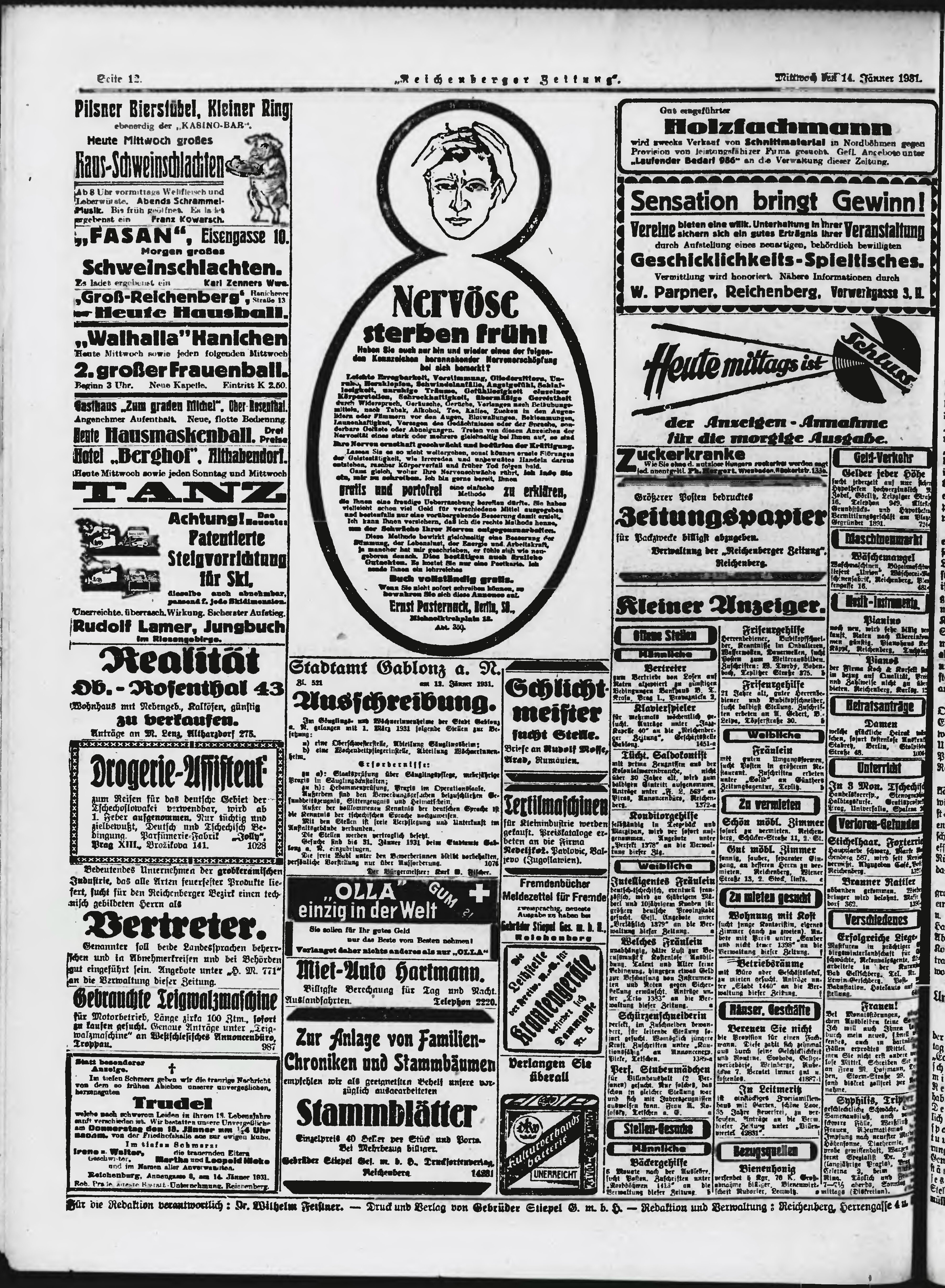 * Datum vydání výtisku: 14.1.1931 Číslo výtisku: 12 Poznámky k výtisku: ranní vydání;