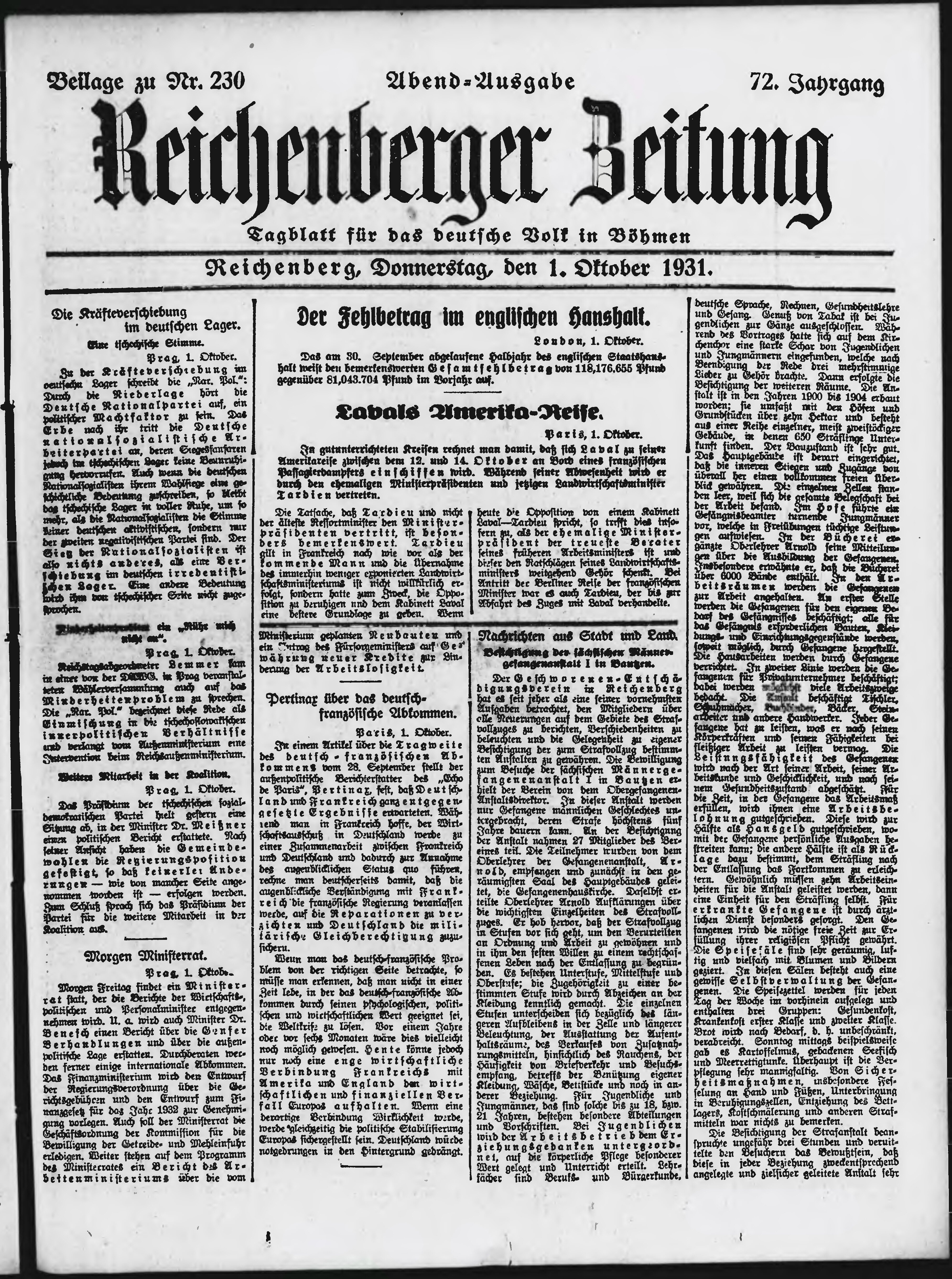 * Datum vydání výtisku: 1.10.1931 Číslo výtisku: 230 Typ výtisku: příloha Poznámky k výtisku: večerní vydání;