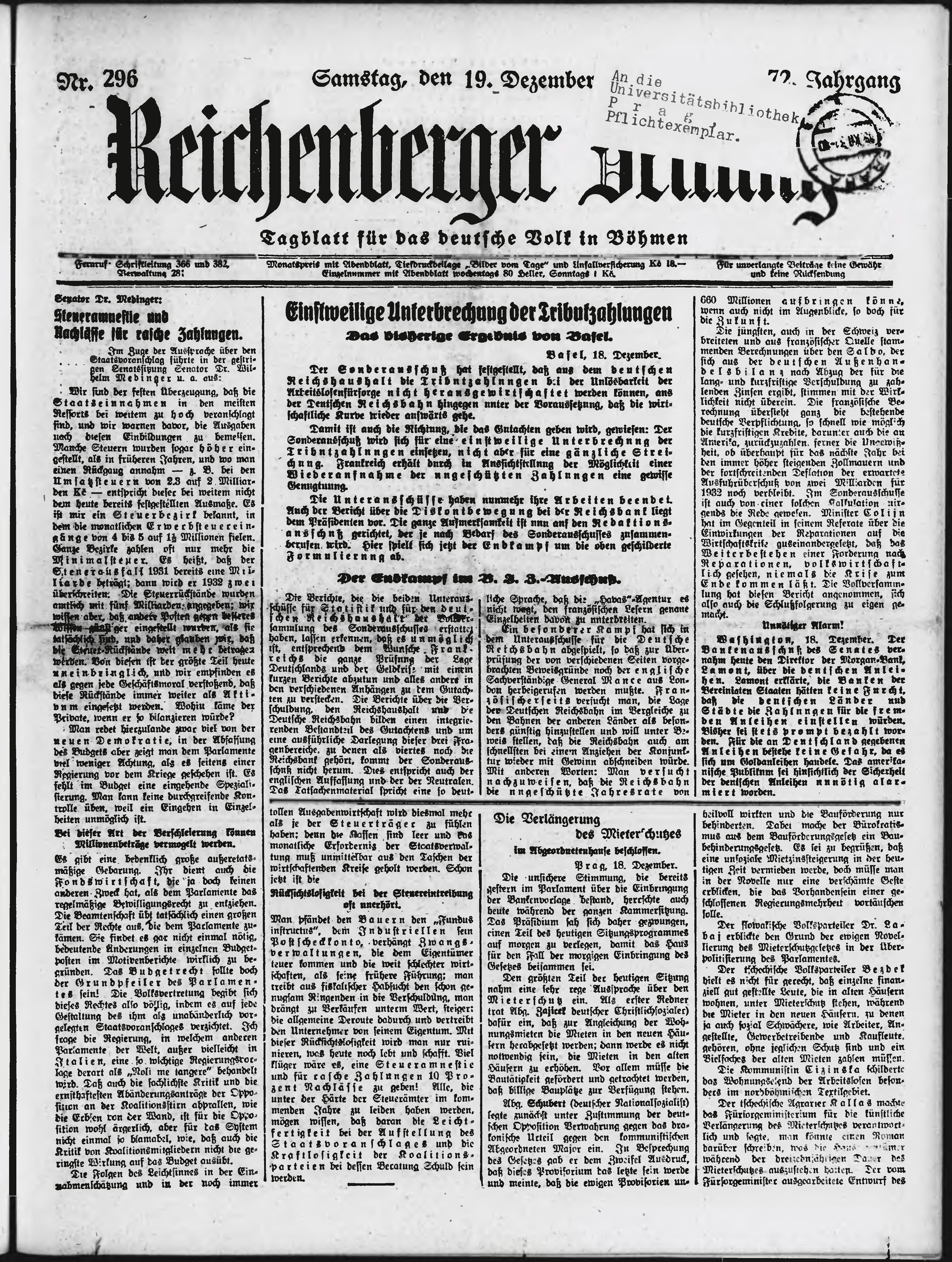 * Datum vydání výtisku: 19.12.1931 Číslo výtisku: 296 Poznámky k výtisku: ranní vydání;