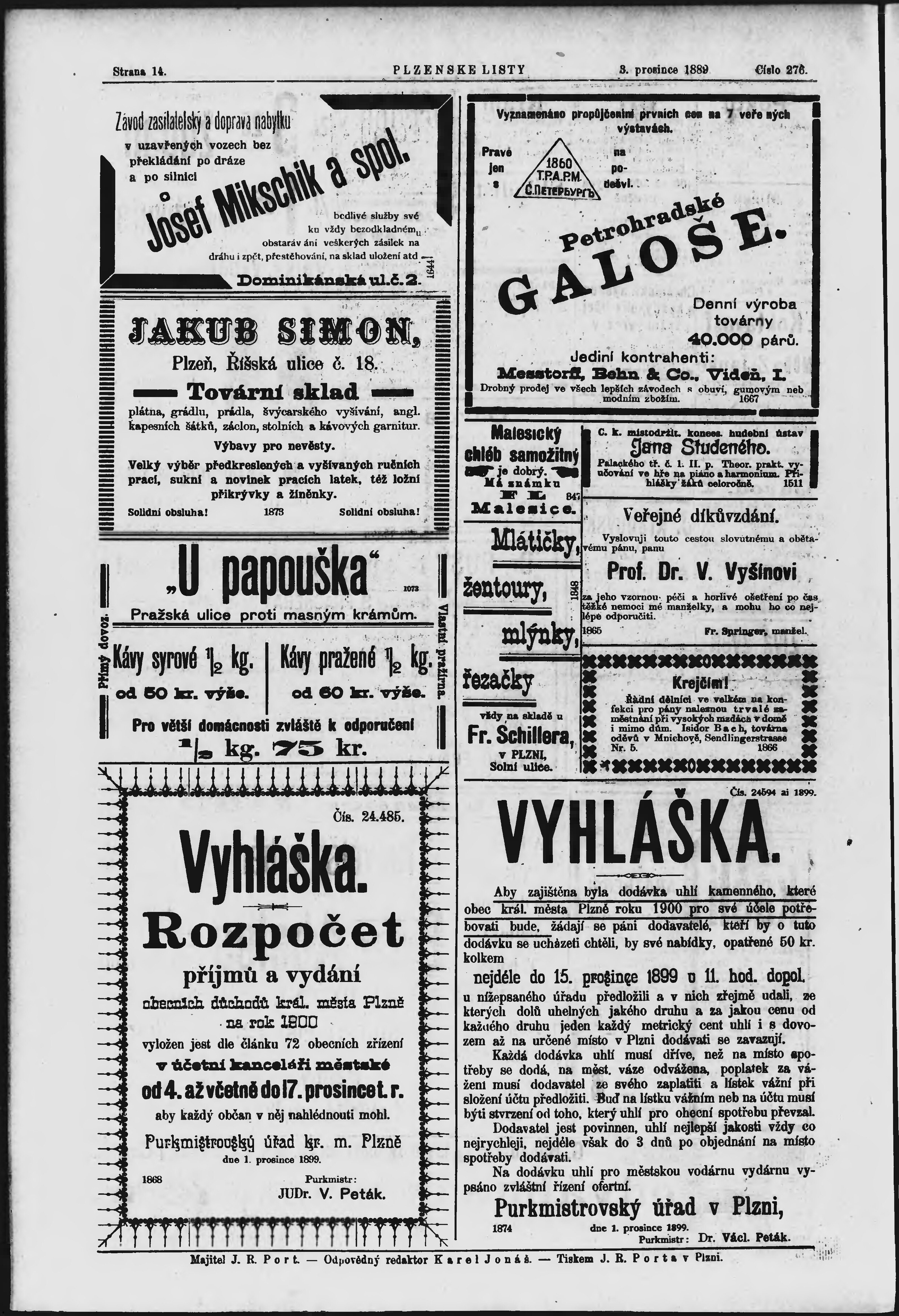 * Datum vydání výtisku: 3.12.1899 Číslo výtisku: 276