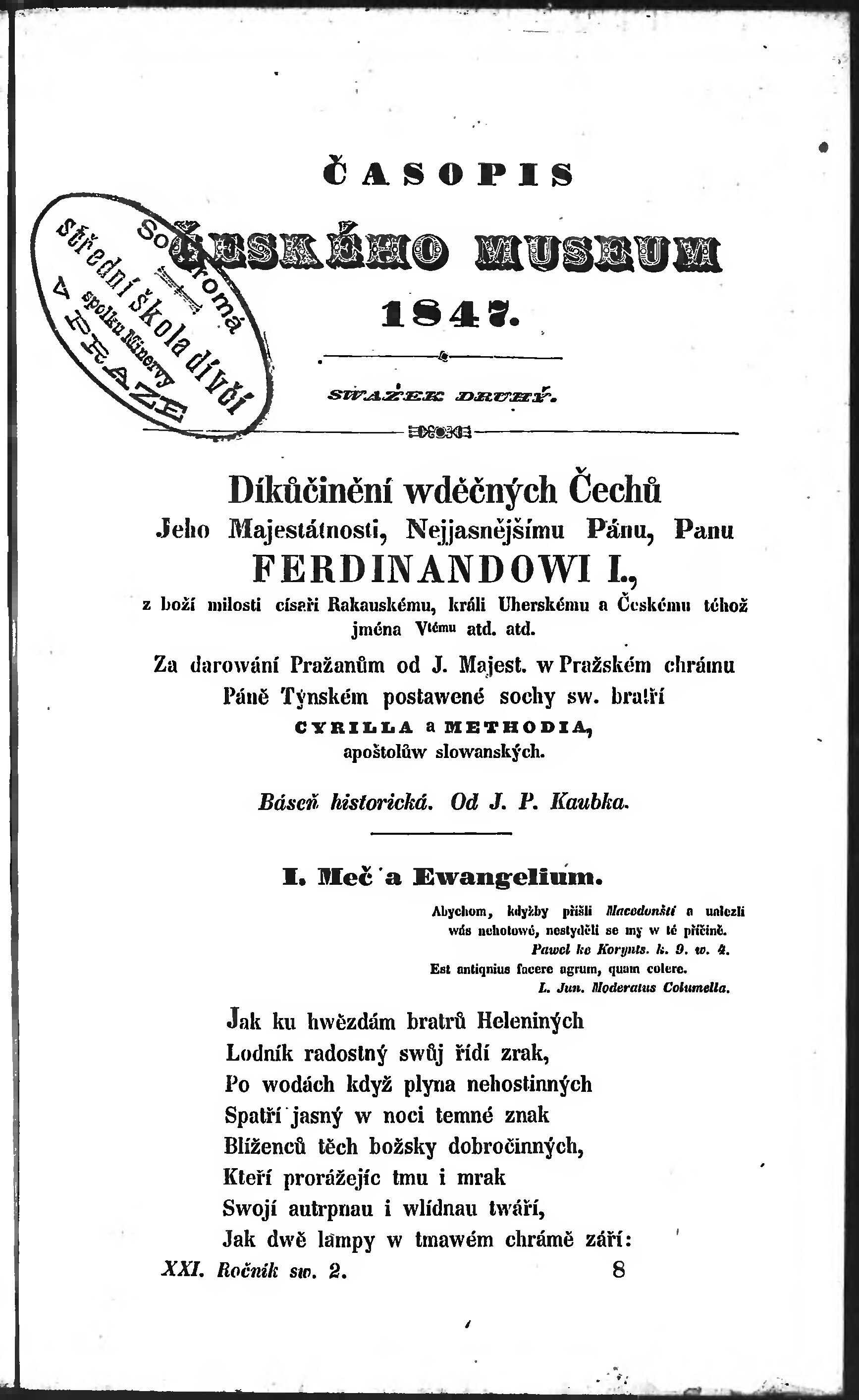 * Datum vydání ročníku: 1847 Číslo ročníku: 21
