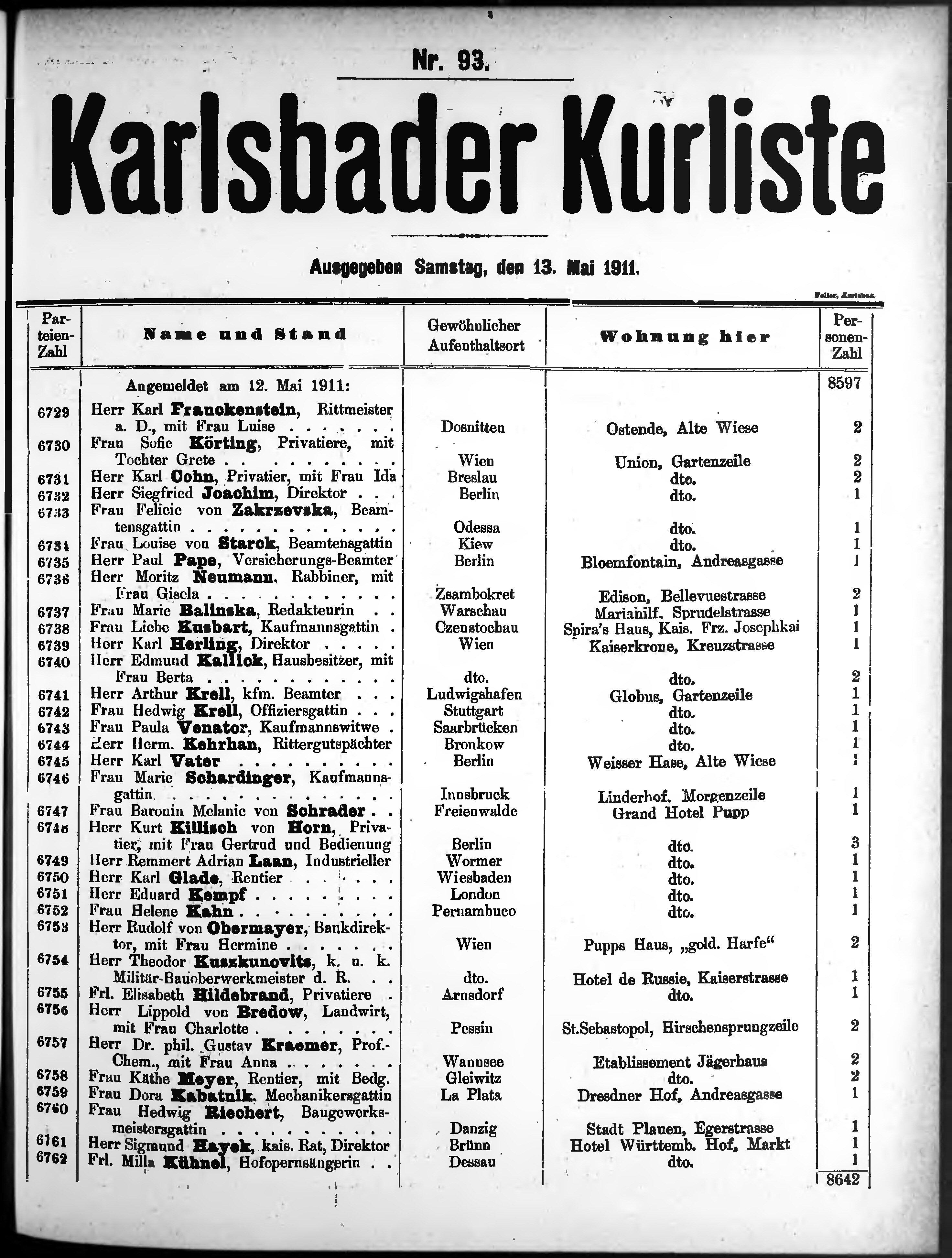 Liste der im Jahre ... angekommenen und abgereisten Kur- und Badegäste in Karlsb...