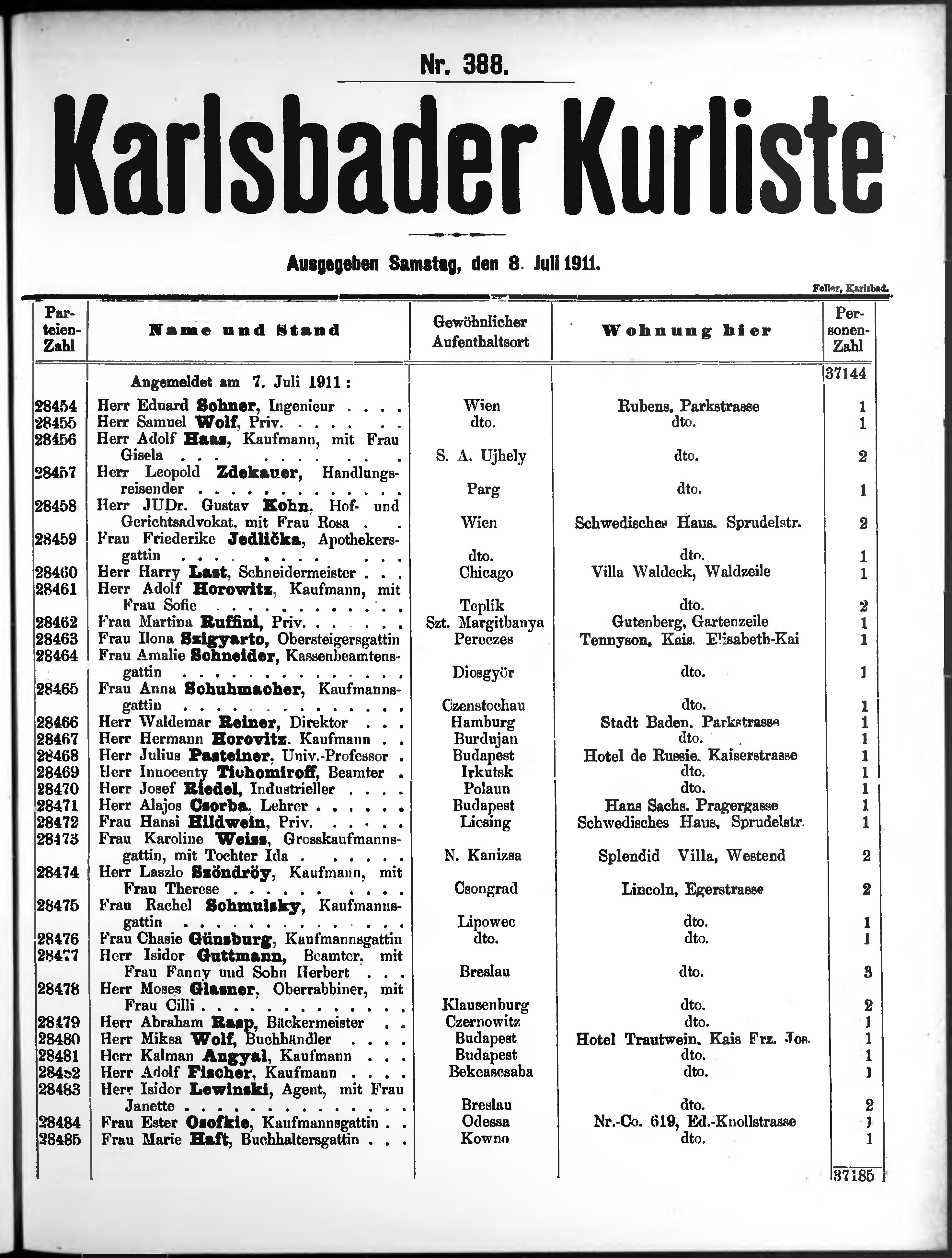 Liste der angekommenen und abgereisten P. T. Curgäste in Carlsbad im Jahre