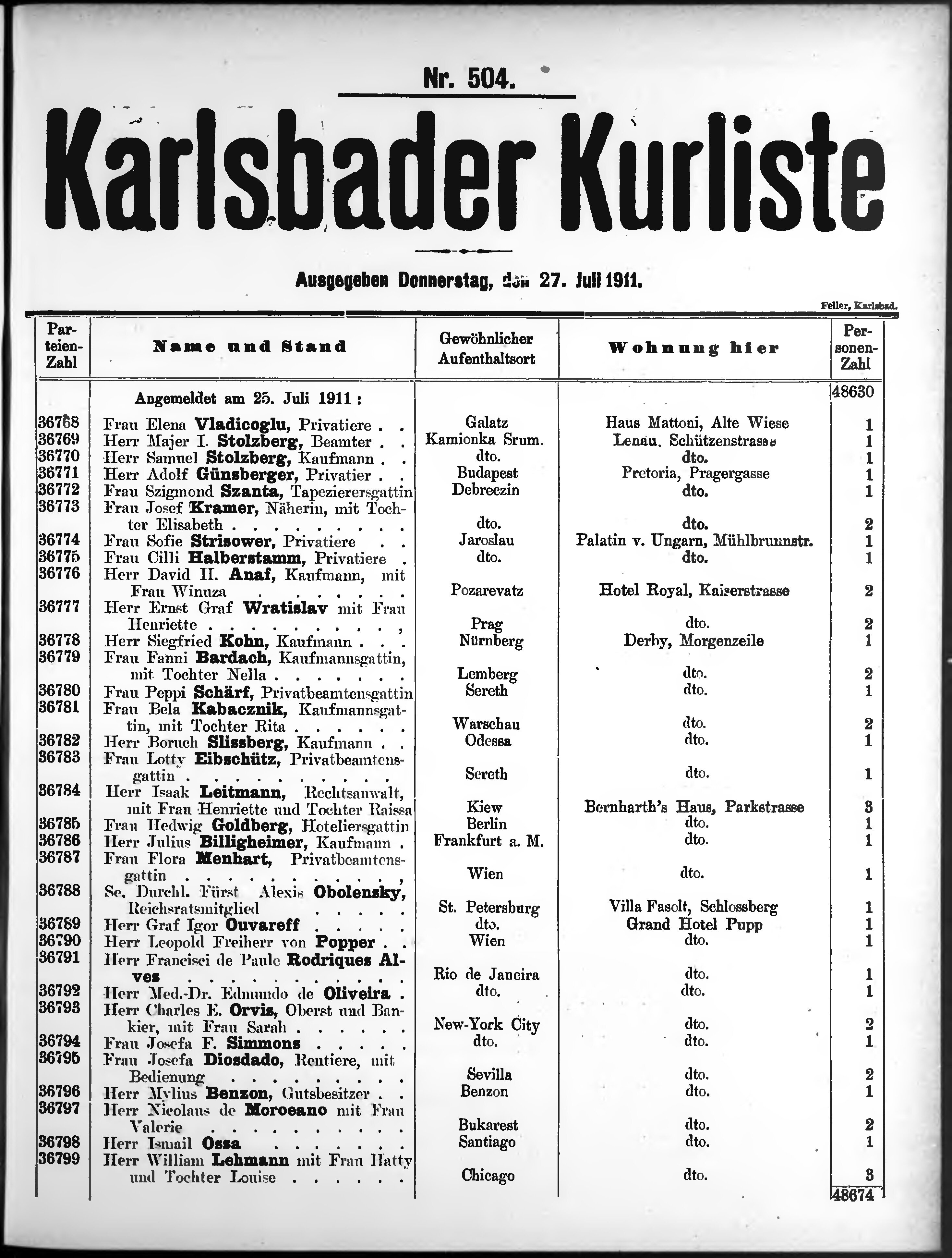 Liste der im Jahre ... angekommenen und abgereisten Kur- und Badegäste in Karlsb...