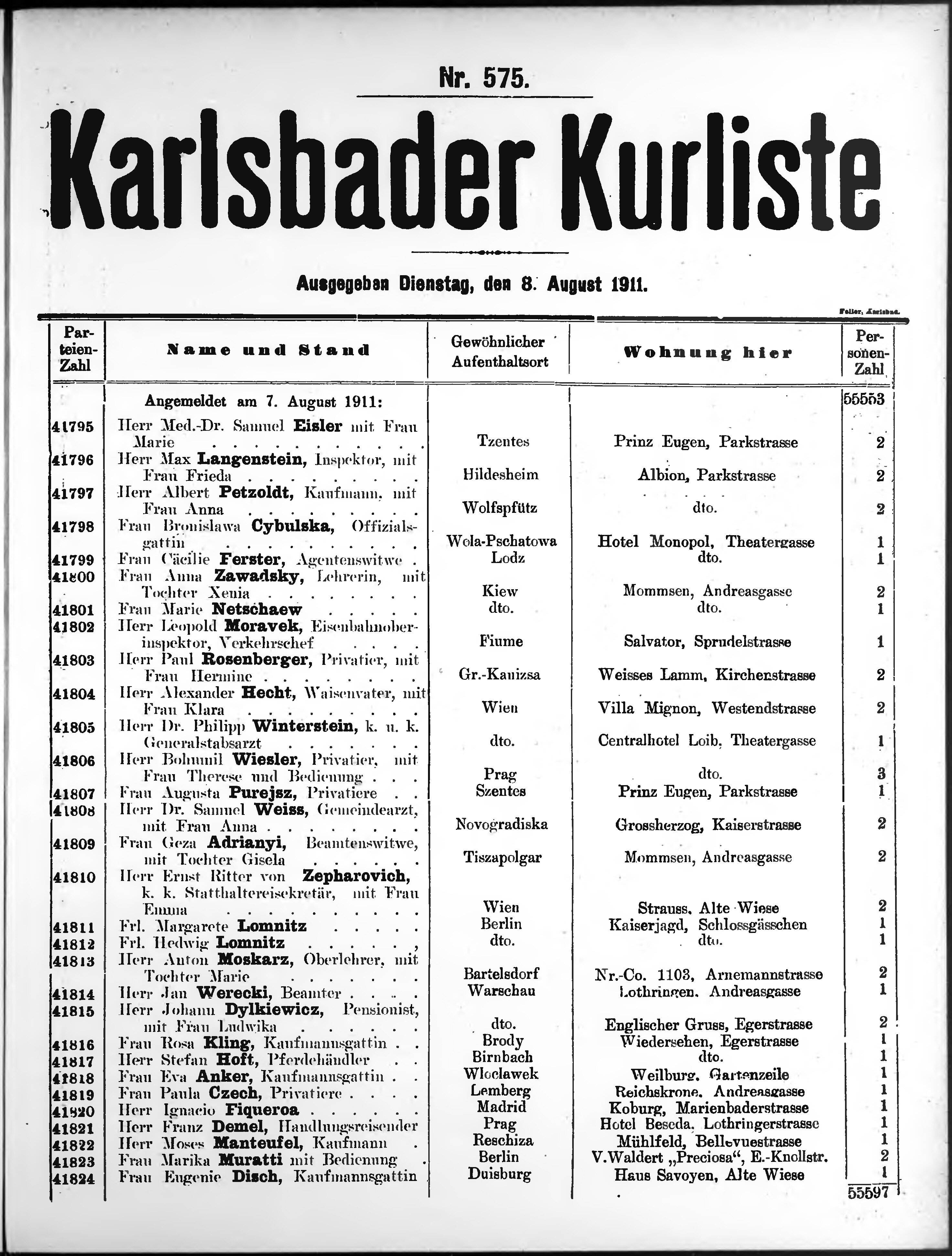 Liste der im Jahre ... angekommenen und abgereisten Kur- und Badegäste in Karlsb...
