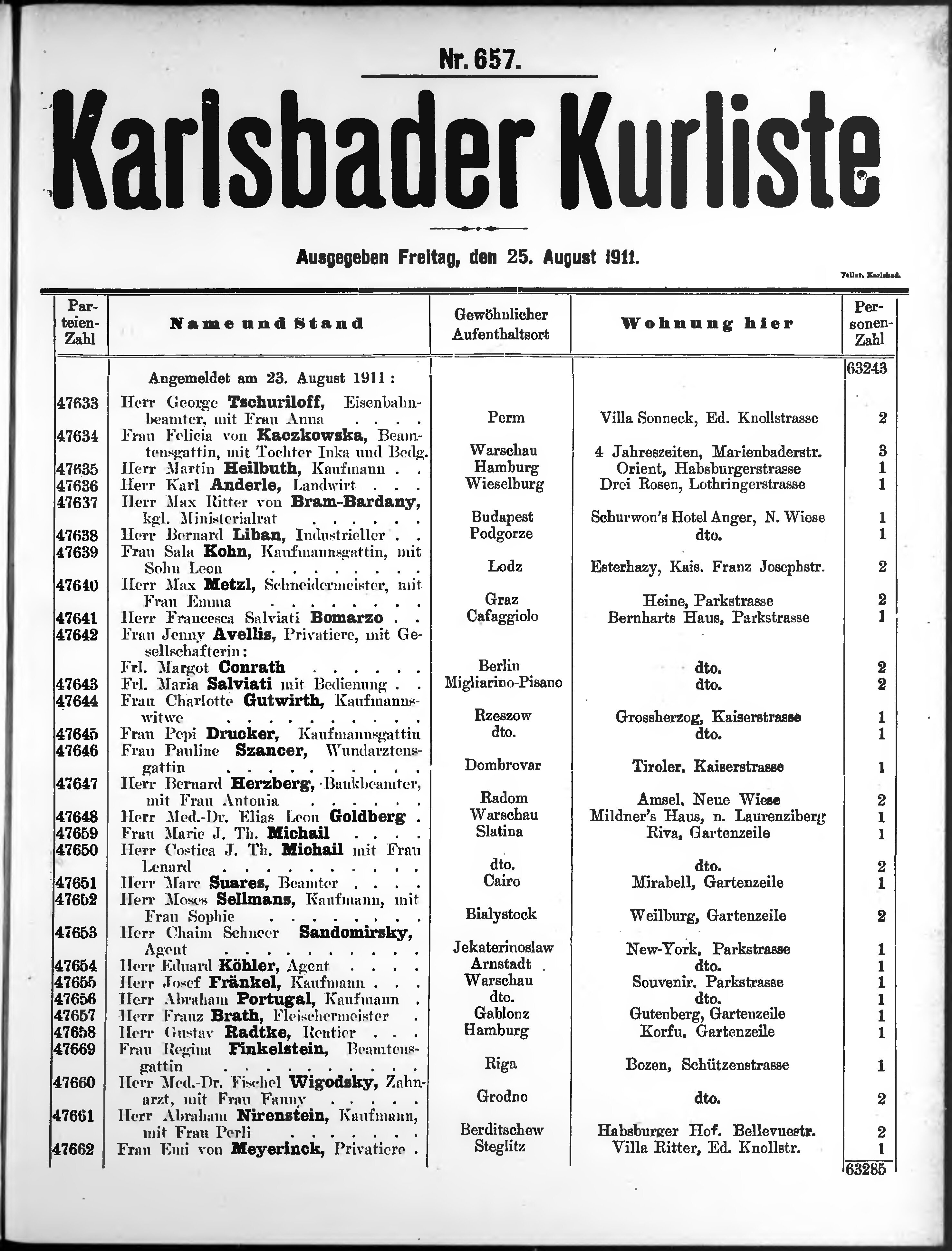 Liste der angekommenen und abgereisten P. T. Curgäste in Carlsbad im Jahre