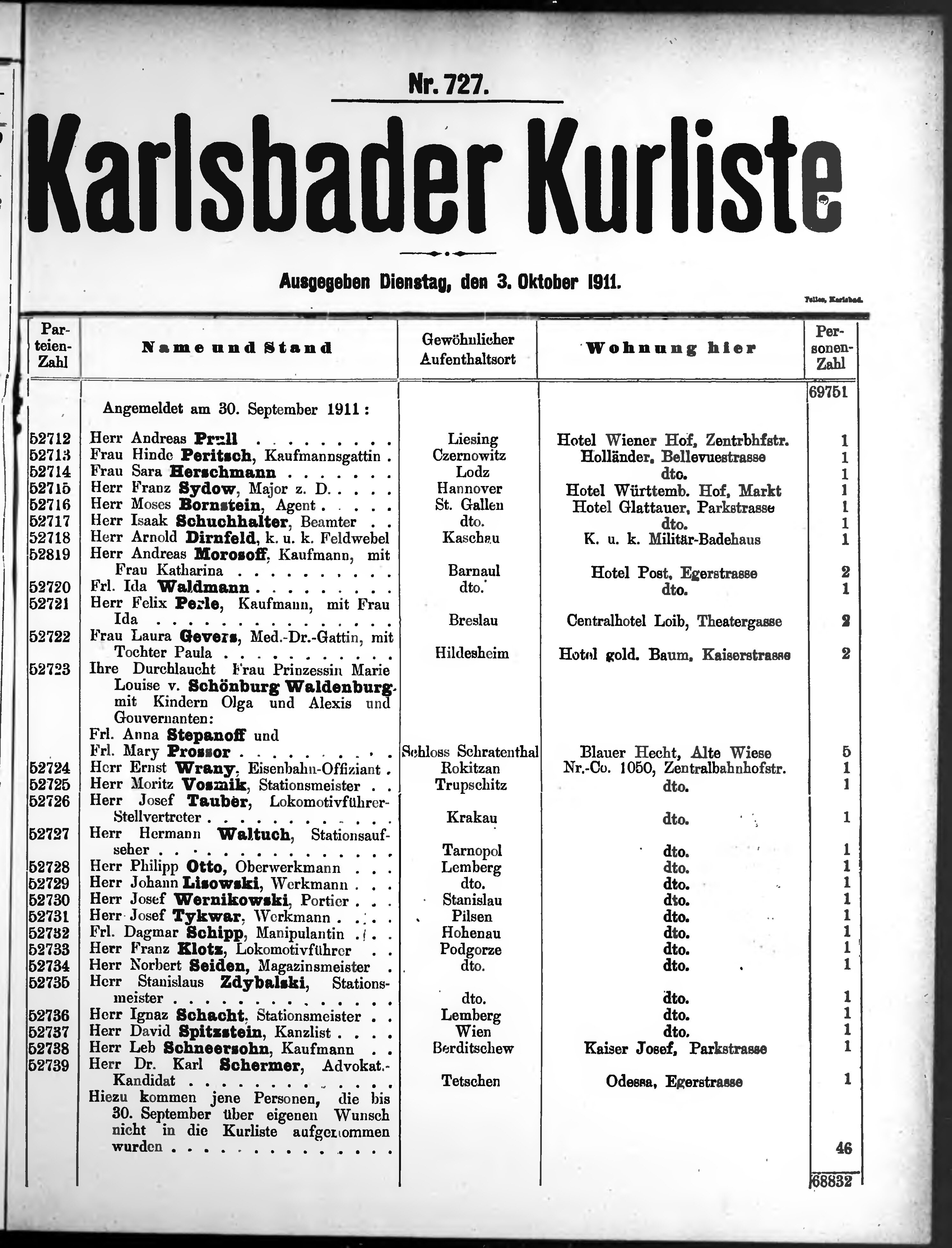 Liste der angekommenen und abgereisten P. T. Curgäste in Carlsbad im Jahre