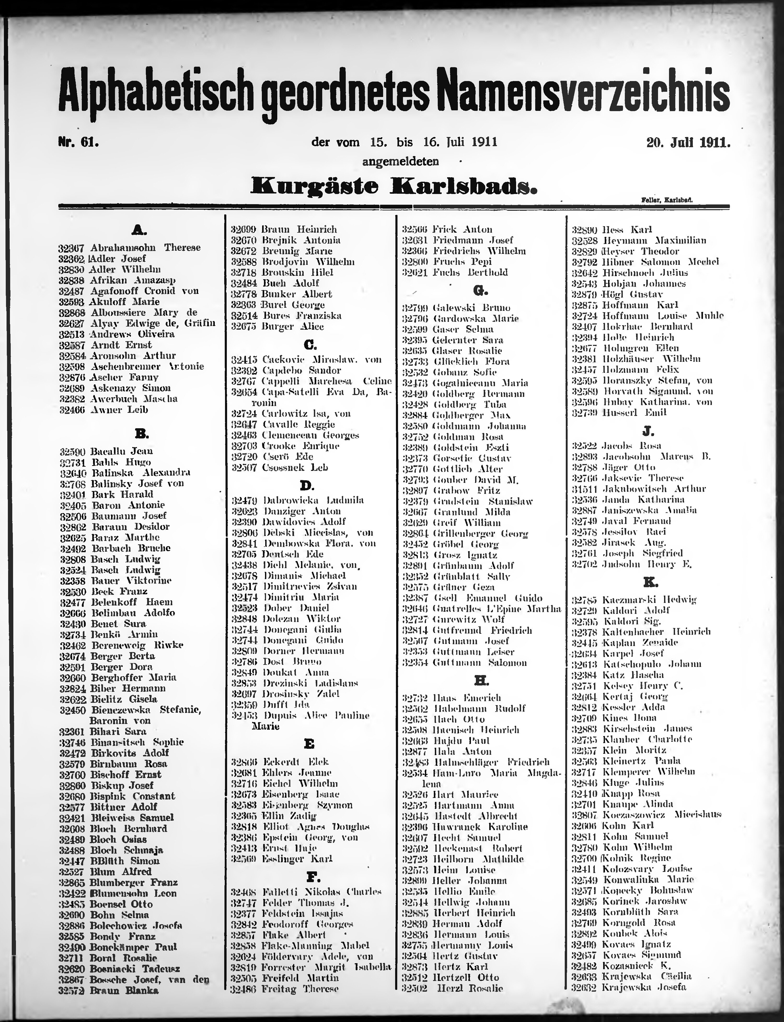 Liste der angekommenen und abgereisten P. T. Curgäste in Carlsbad im Jahre