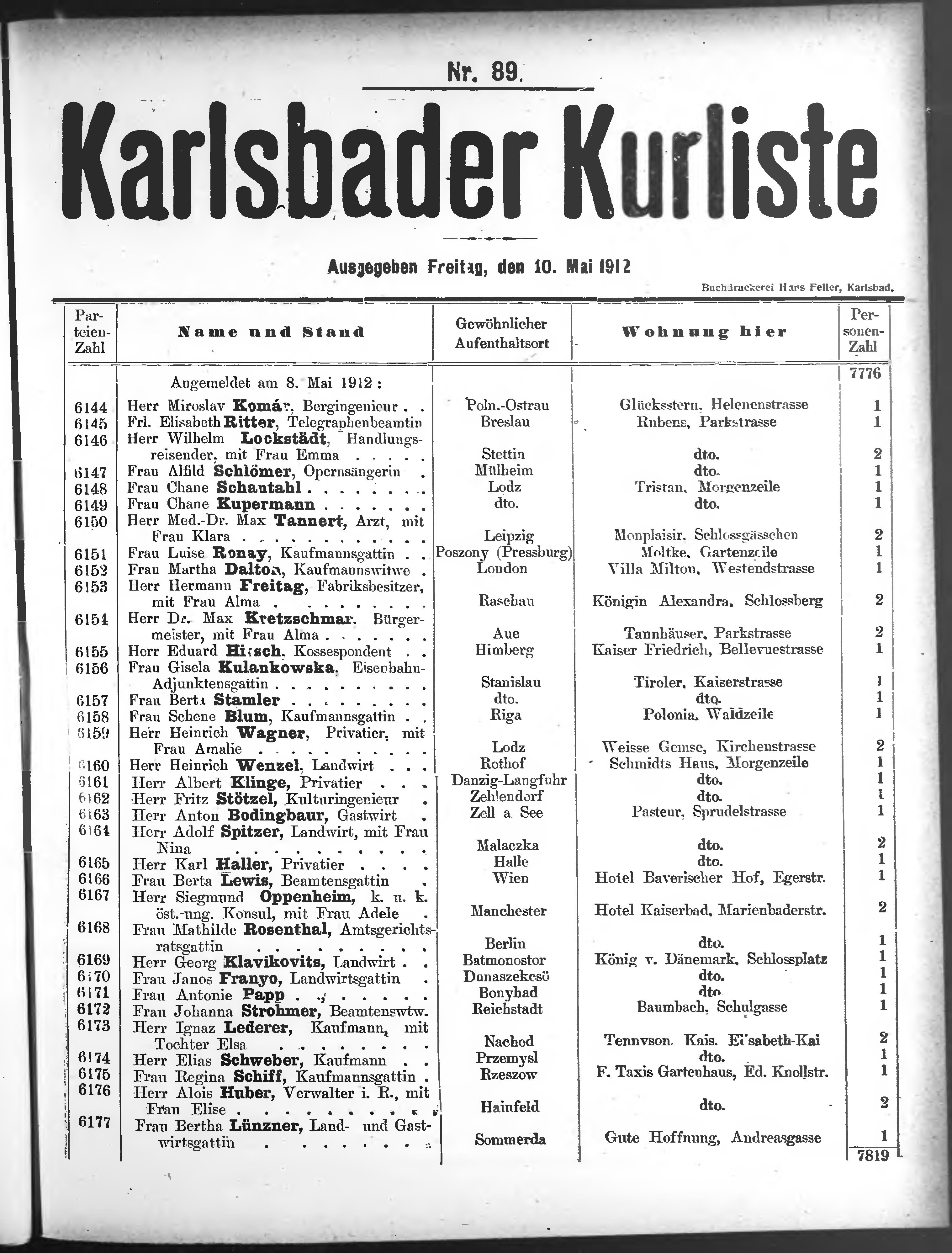 Liste der P.T. Curgäste in Carlsbad ...