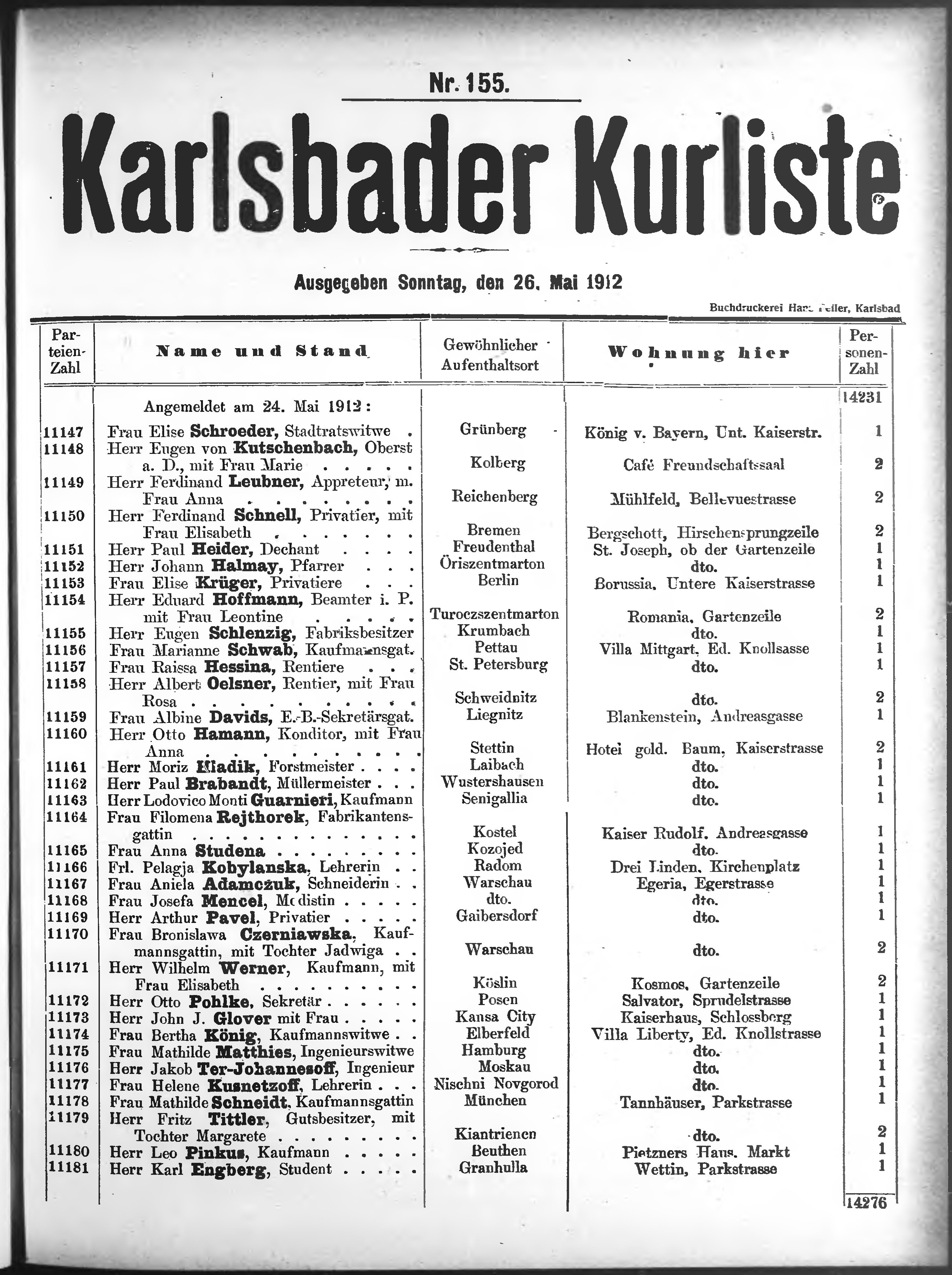 Liste der angekommenen und abgereisten P. T. Curgäste in Carlsbad im Jahre