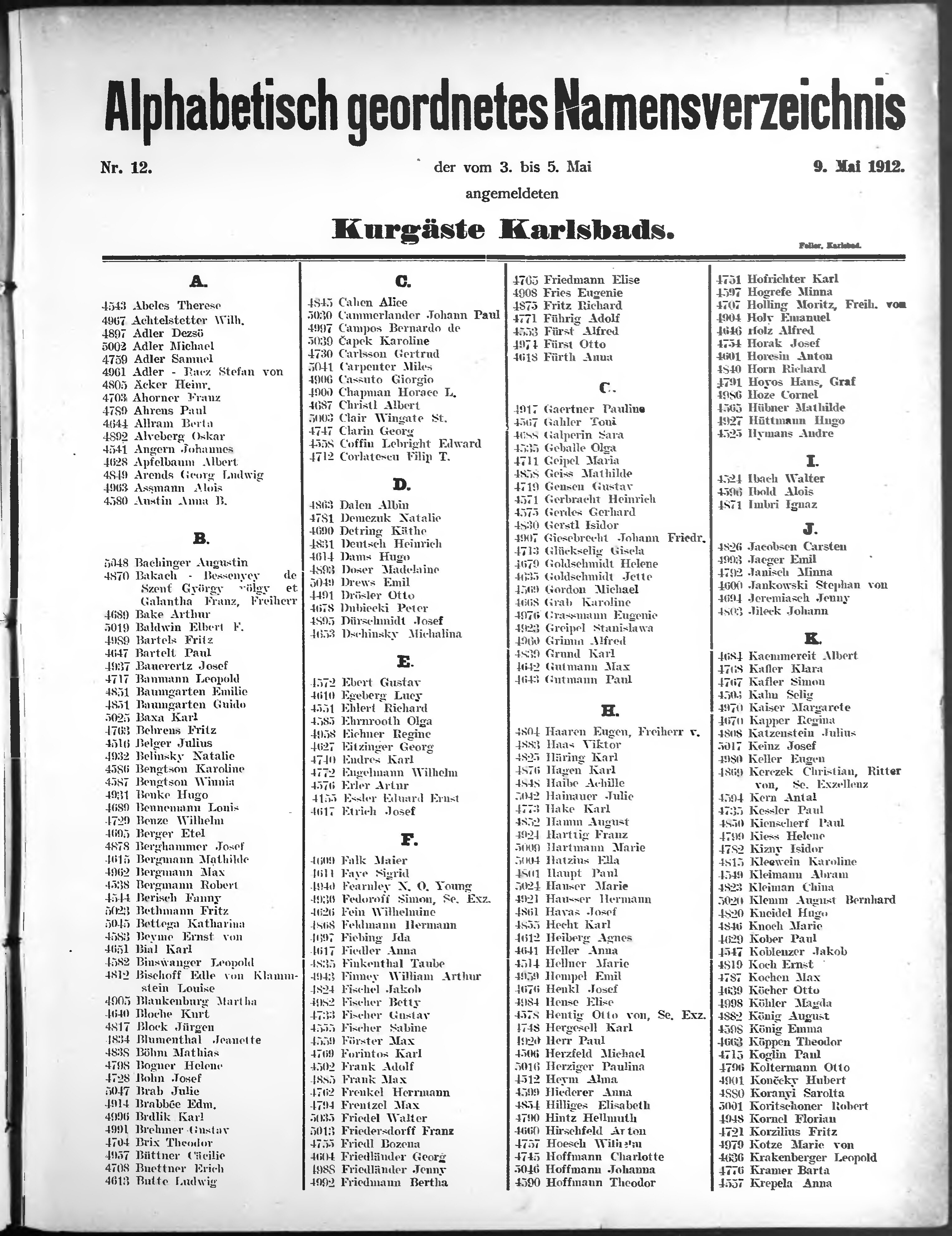 Liste der angekommenen und abgereisten P. T. Curgäste in Carlsbad im Jahre