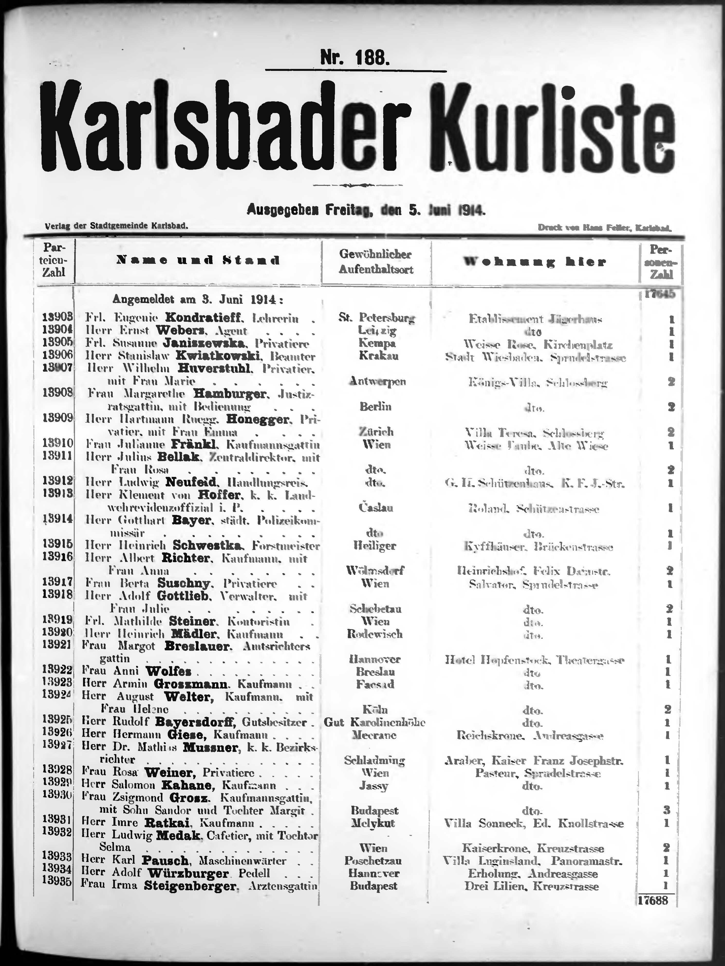Liste der im Jahre ... angekommenen und abgereisten Kur- und Badegäste in Karlsb...