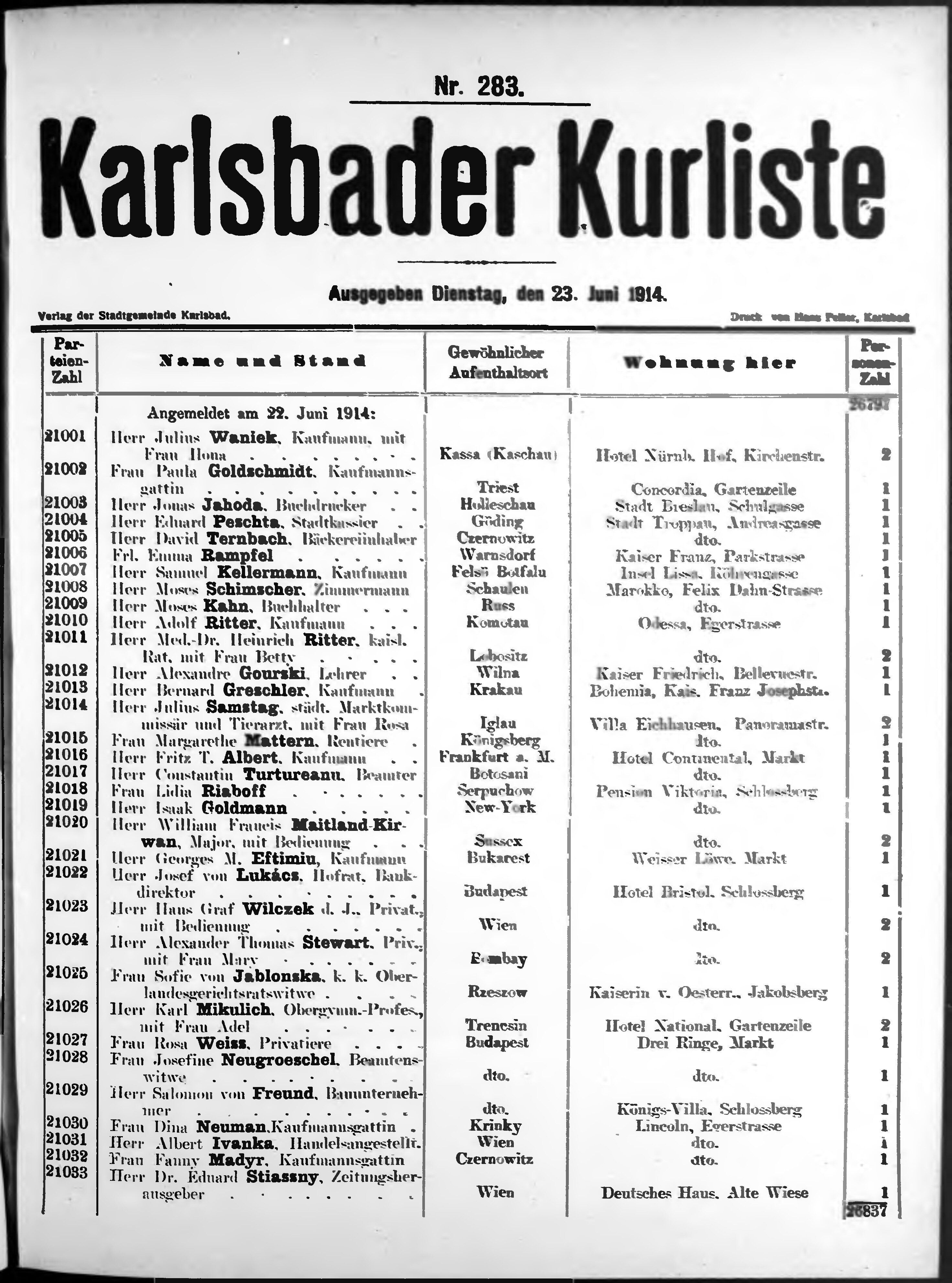 Liste der im Jahre ... angekommenen und abgereisten Kur- und Badegäste in Karlsb...