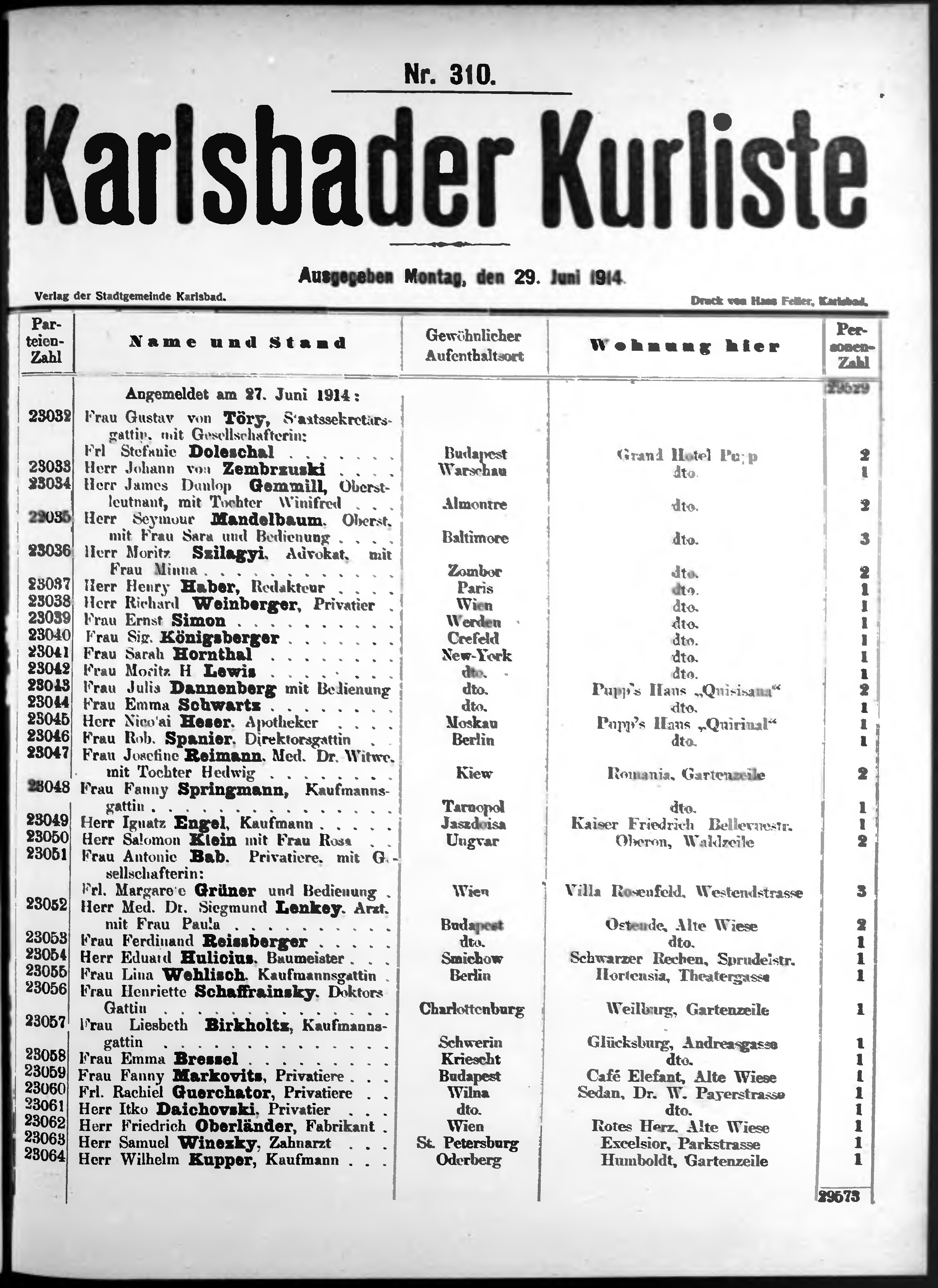 Liste der im Jahre ... angekommenen und abgereisten Kur- und Badegäste in Karlsb...