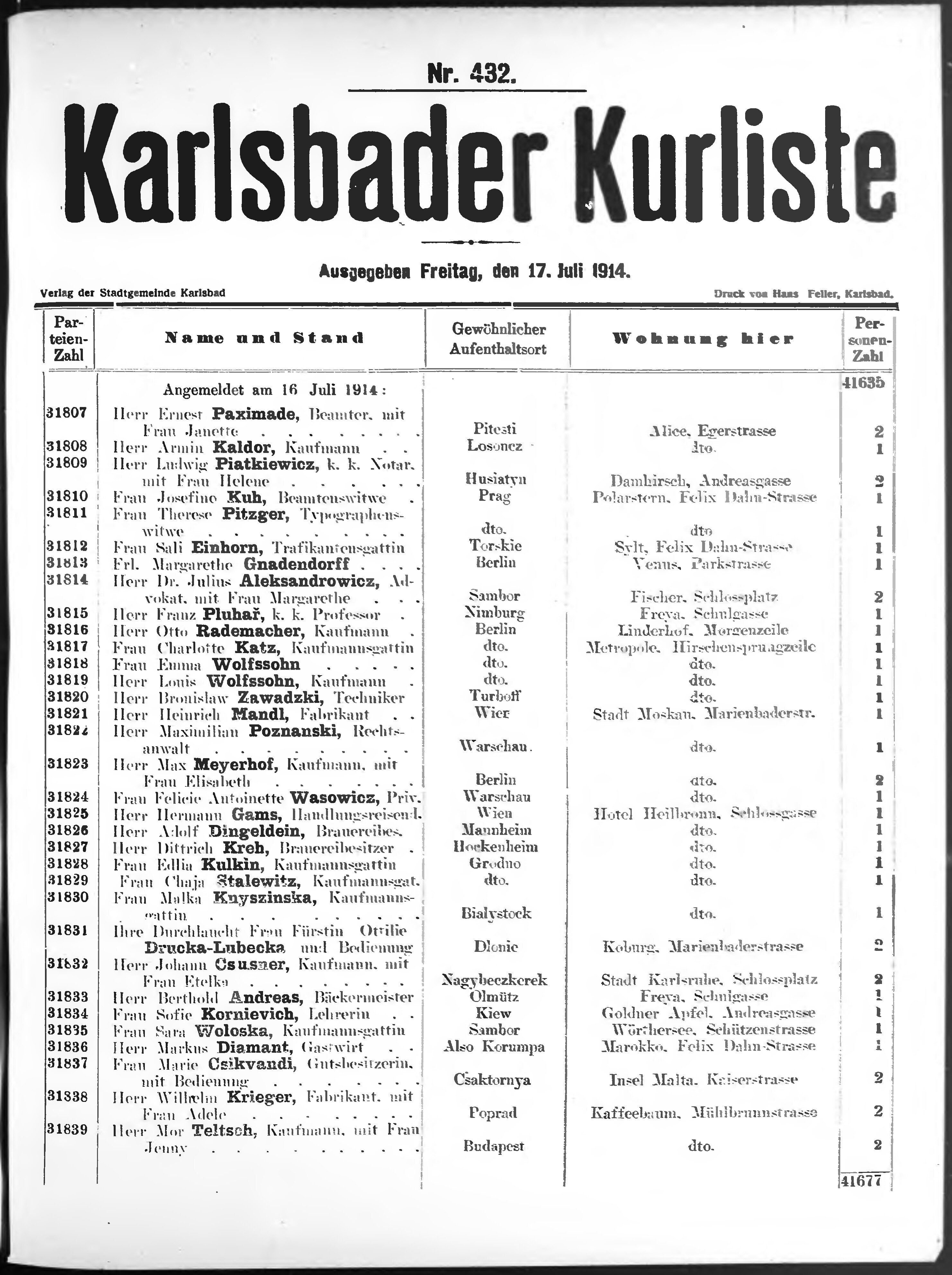* Datum vydání výtisku: 17.7.1914 Číslo výtisku: 432