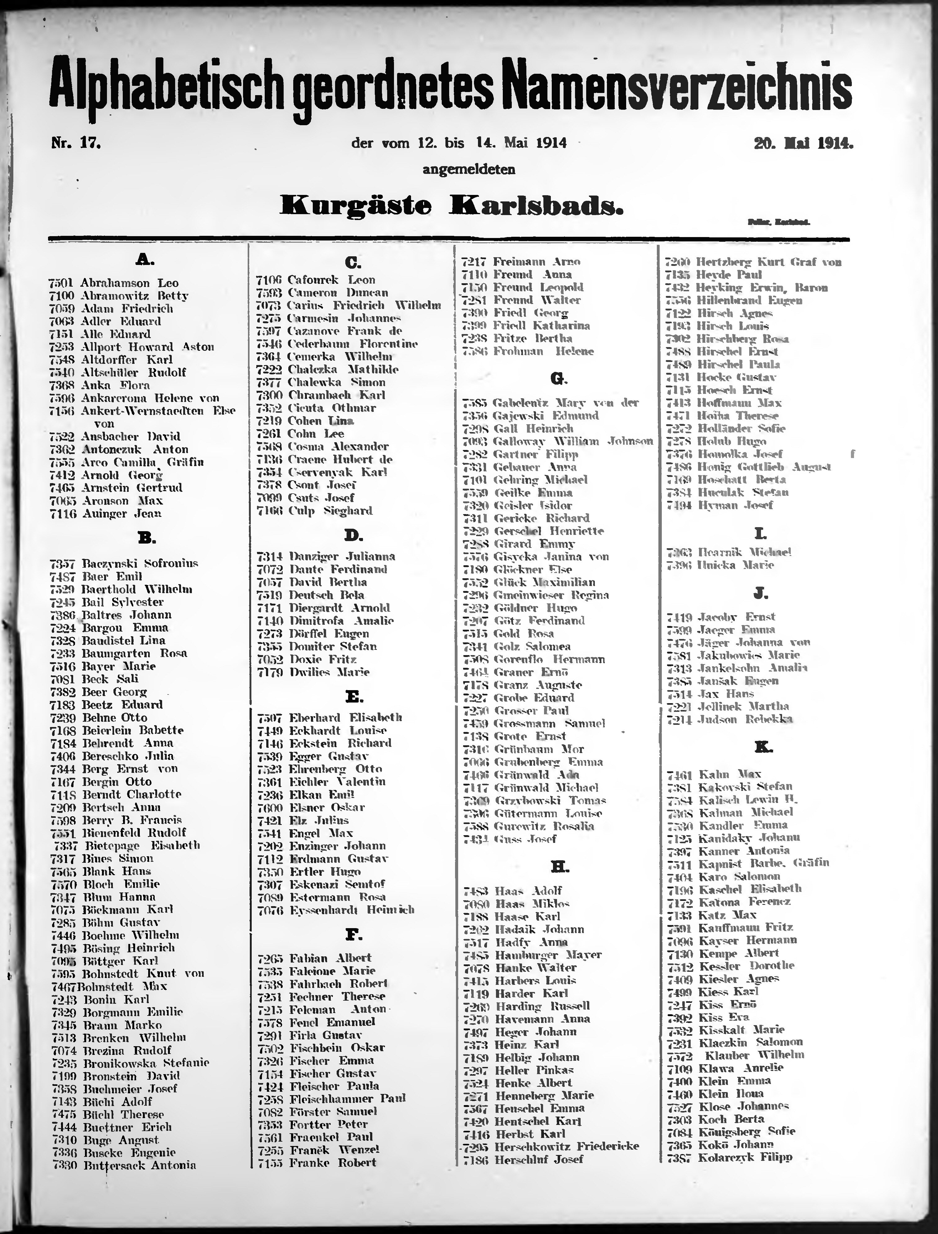 Liste der P.T. Curgäste in Carlsbad ...