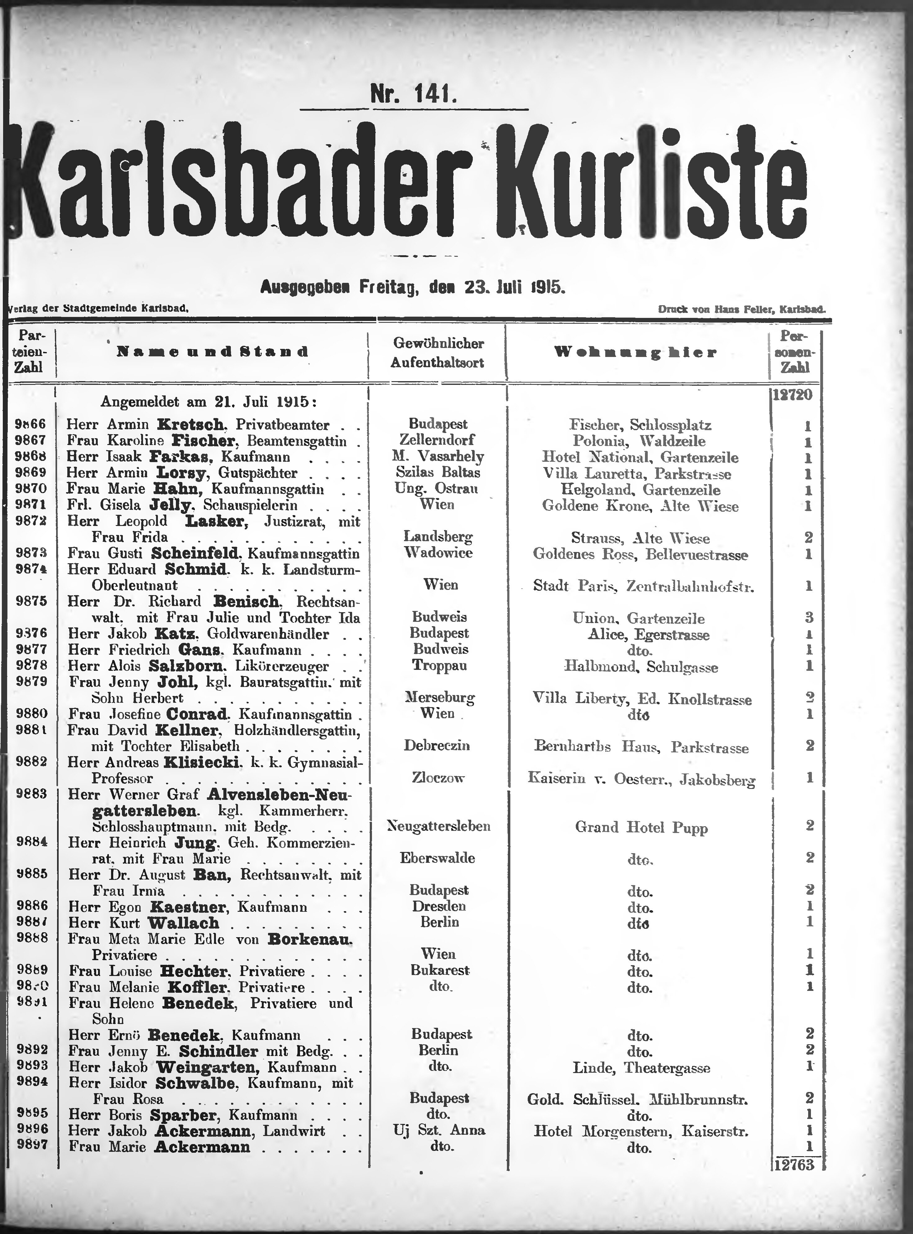 * Datum vydání výtisku: 23.7.1915 Číslo výtisku: 141