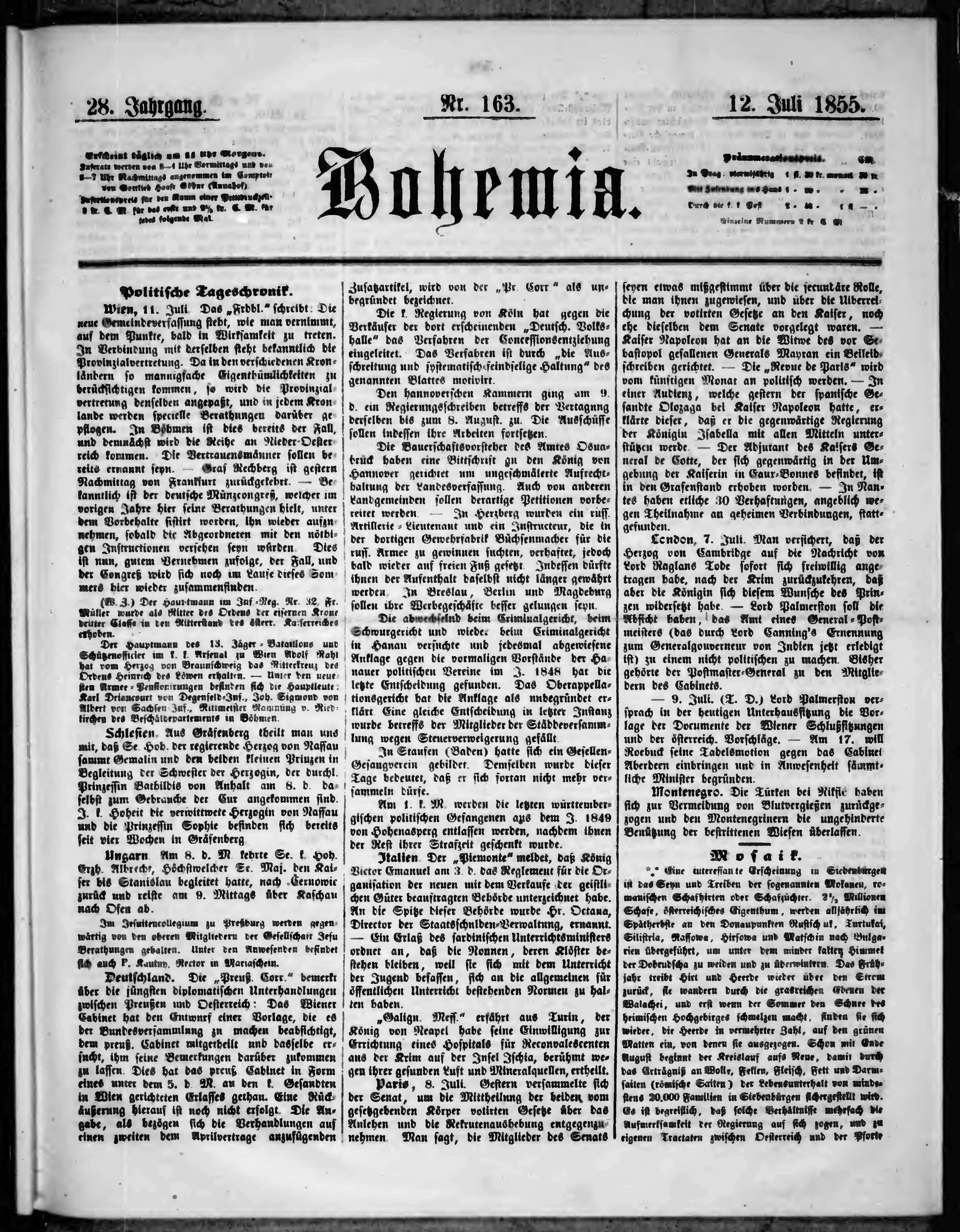 * Datum vydání výtisku: 12.7.1855 Číslo výtisku: 163