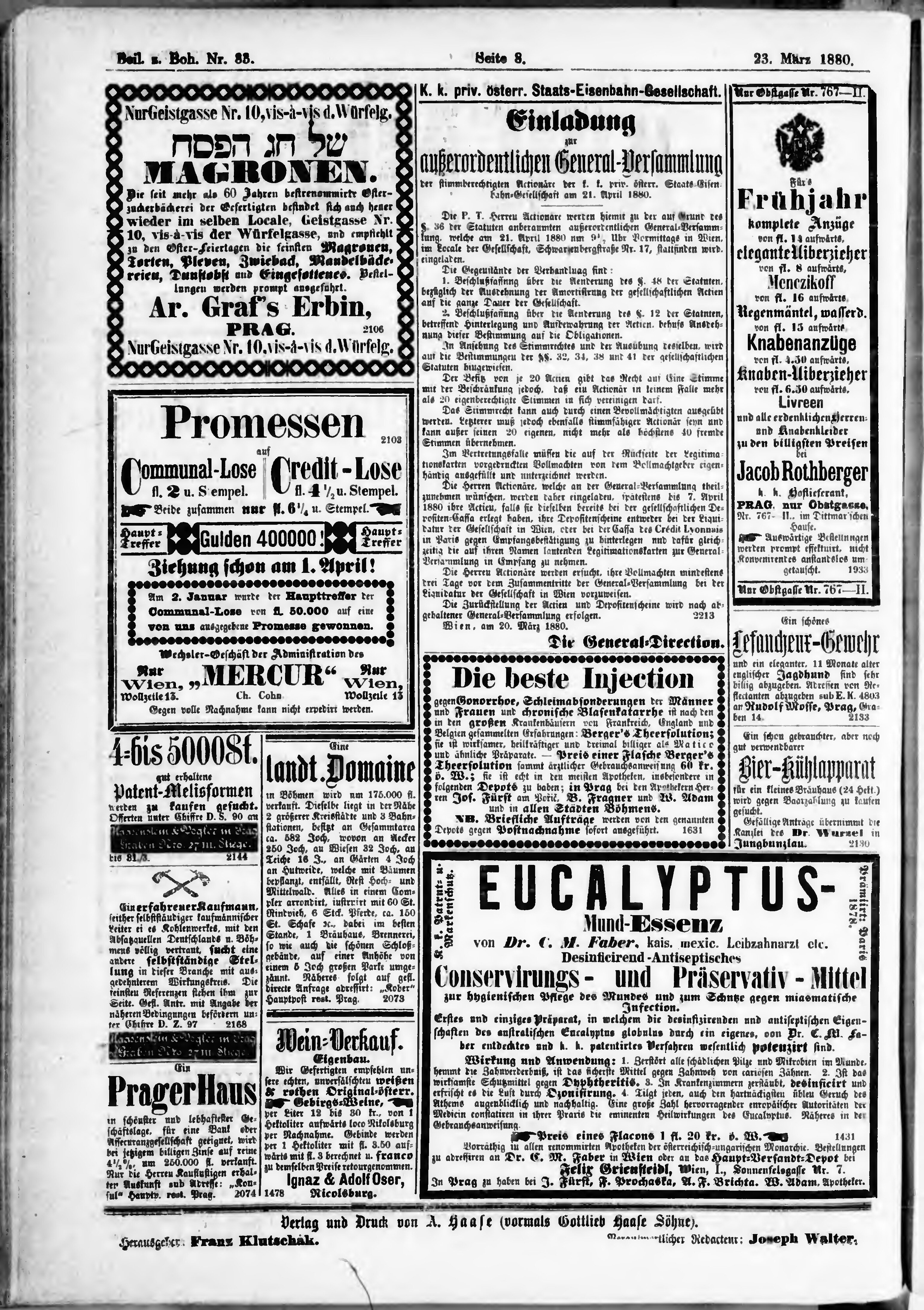 * Datum vydání výtisku: 23.3.1880 Číslo výtisku: 83 Typ výtisku: příloha