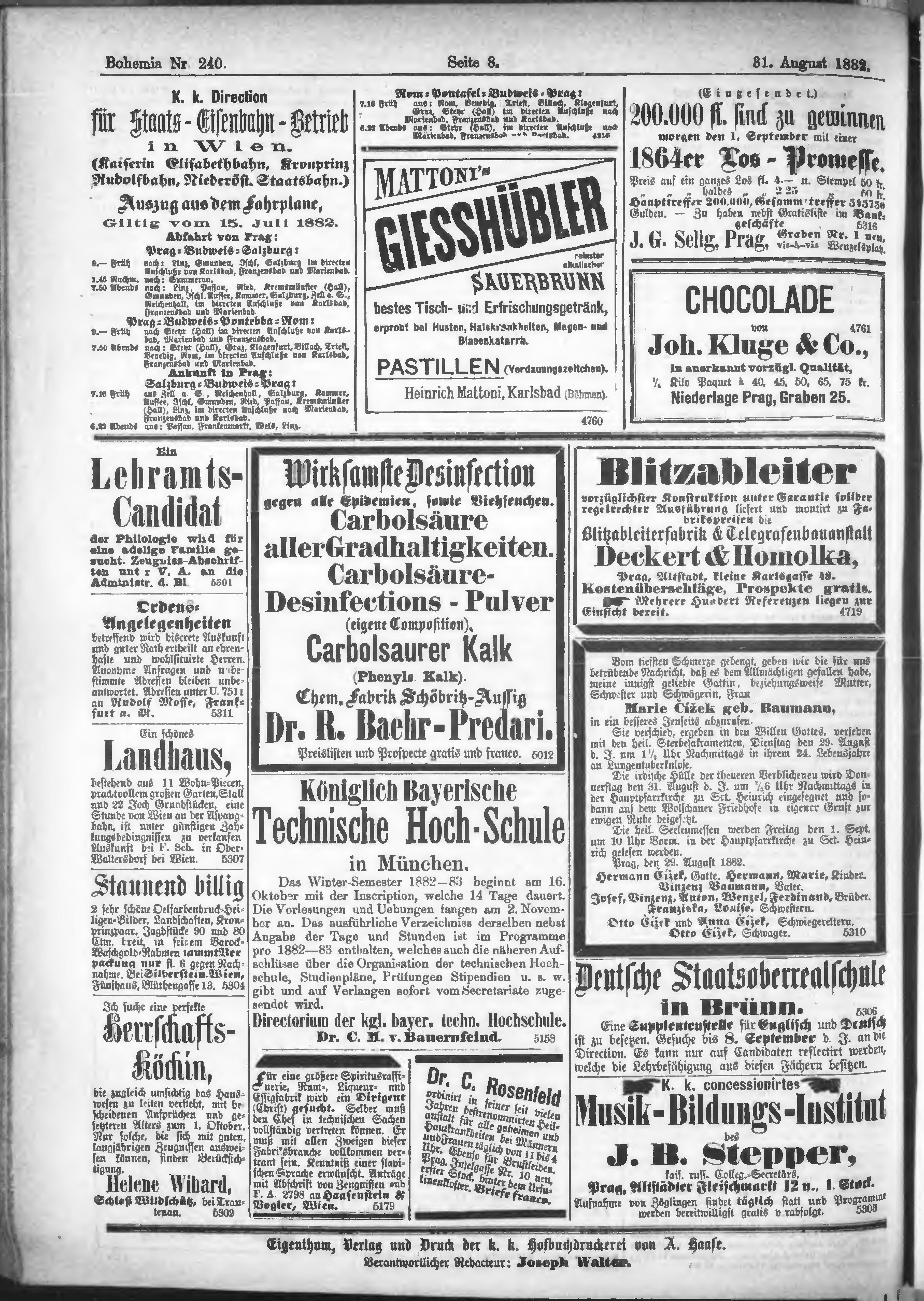 * Datum vydání výtisku: 31.8.1882 Číslo výtisku: 240