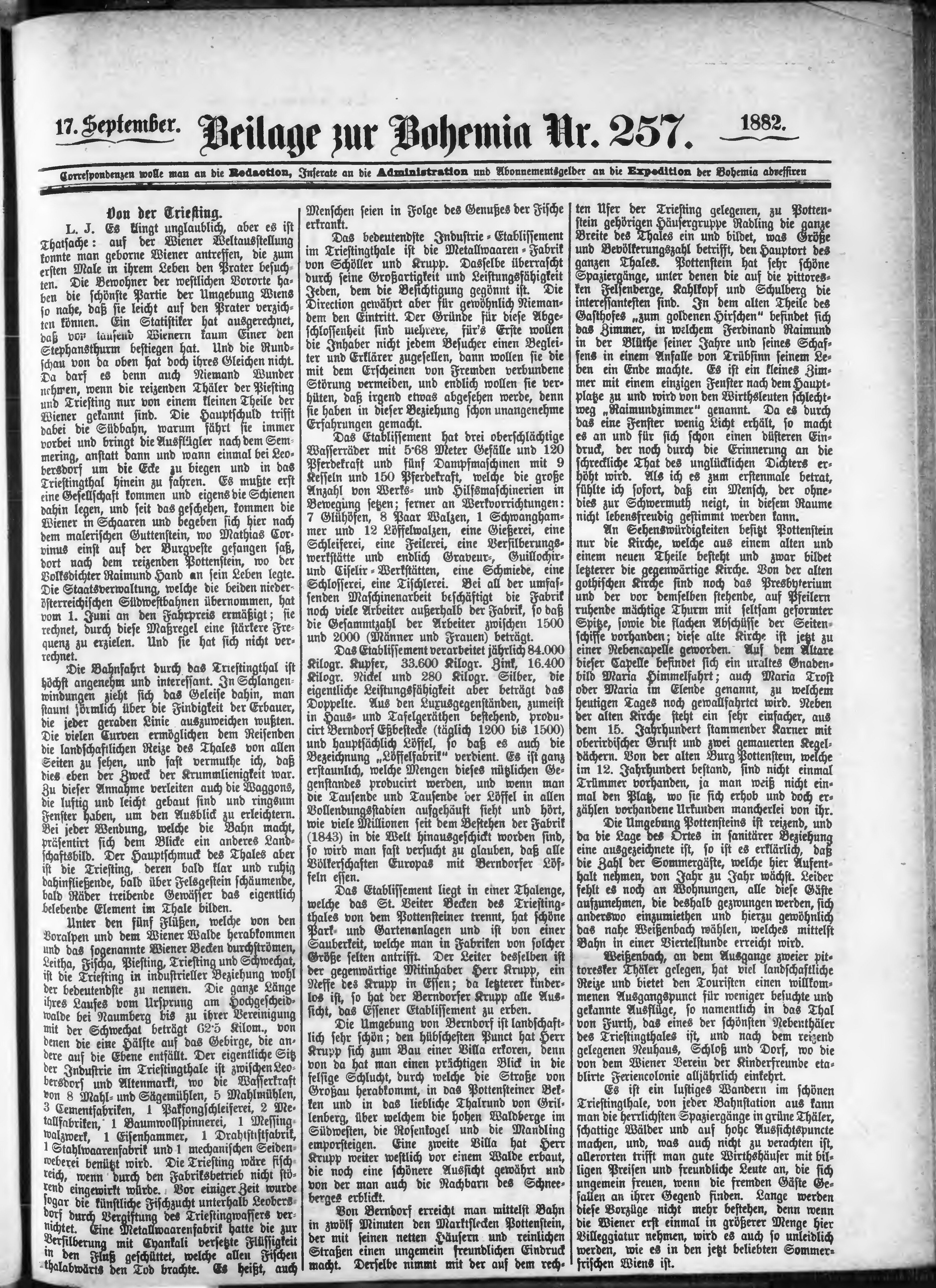 * Datum vydání výtisku: 17.9.1882 Číslo výtisku: 257 Typ výtisku: příloha