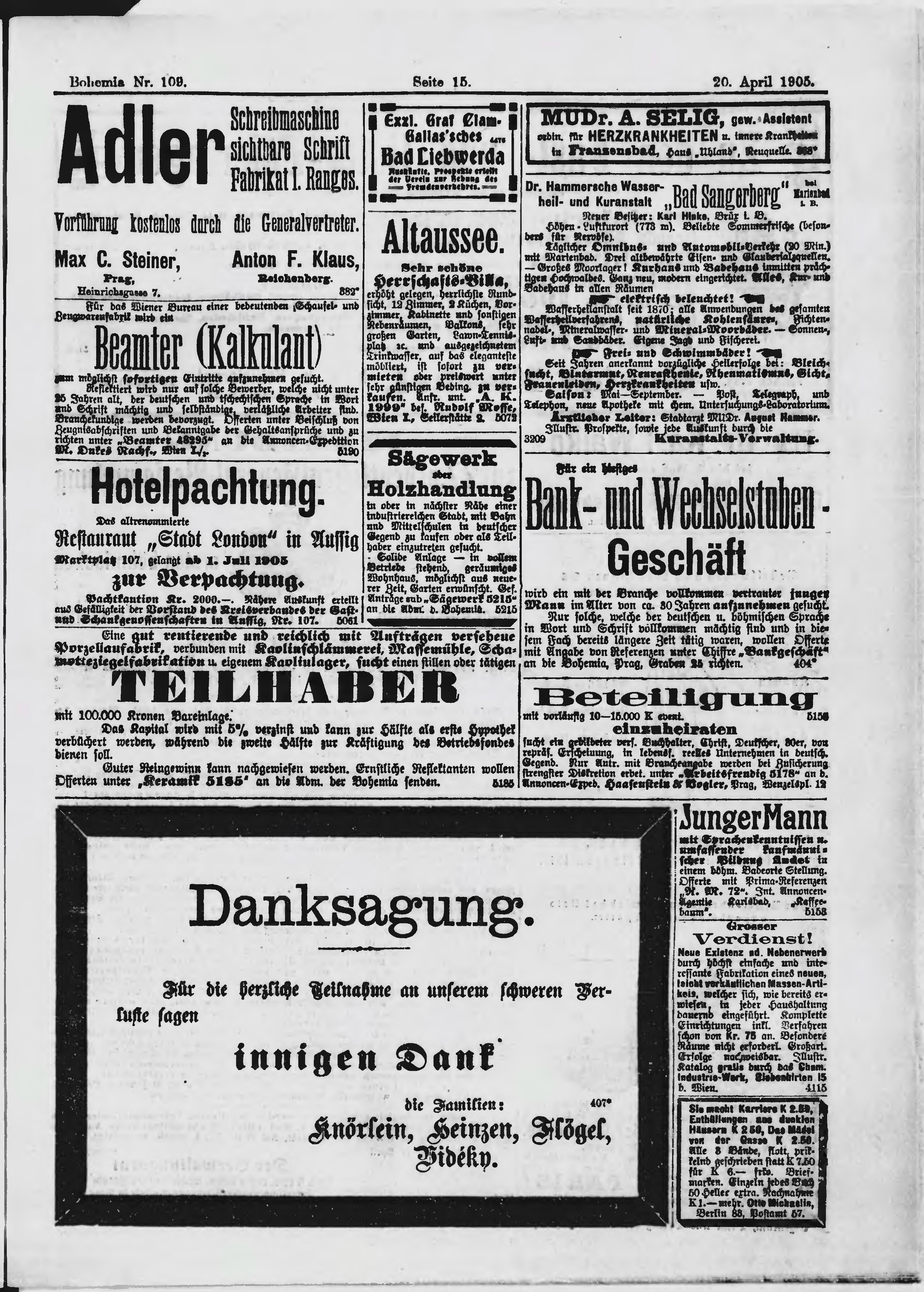 * Datum vydání výtisku: 20.4.1905 Číslo výtisku: 109 Poznámky k výtisku: ranní vydání;